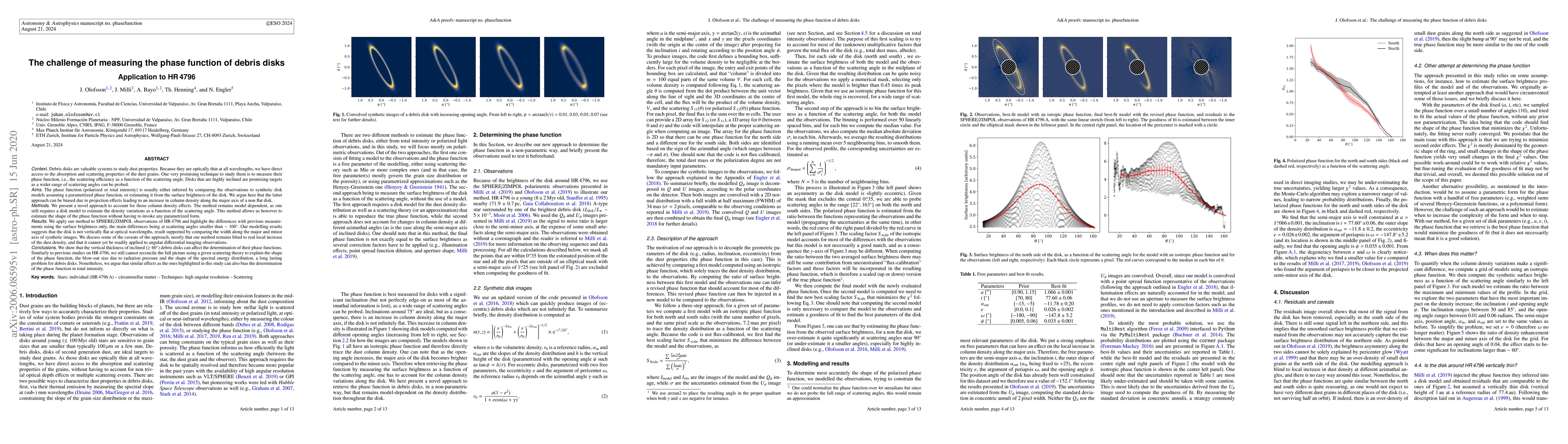 Abridged: Debris disks are valuable systems to study dust properties. Because they are optically thin at all wavelengths, we have direct access to the properties of dust grains. One very promising technique to study them is to measure their phase function. Disks that are highly inclined are promising targets as a wider range of scattering angles can be probed. The phase function is usually either inferred by comparing the observations to synthetic disk models assuming a parametrized phase function, or estimating it from the surface brightness of the disk. We argue here that the latter approach can be biased due to projection effects leading to an increase in column density along the major axis of a non flat disk. We present a novel approach to account for those column density effects. The method remains model dependent, as one still requires a disk model to estimate the density variations as a function of the scattering angle. This method allows us however to estimate the shape of the phase function without having to invoke any parametrized form. We apply our method to SPHERE/ZIMPOL observations of HR\,4796 and highlight the differences with previous measurements. Our modelling results suggest that the disk is not vertically flat at optical wavelengths. We discuss some of the caveats of the approach, mostly that our method remains blind to real local increase of the dust density, and that it cannot yet be readily applied to angular differential imaging observations. Similarly to previous studies on HR\,4796, we still cannot reconcile the full picture using a given scattering theory to explain the shape of the phase function, a long lasting problem for debris disks. Nonetheless, we argue that similar effects as the ones highlighted in this study can also bias the determination of the phase function in total intensity.