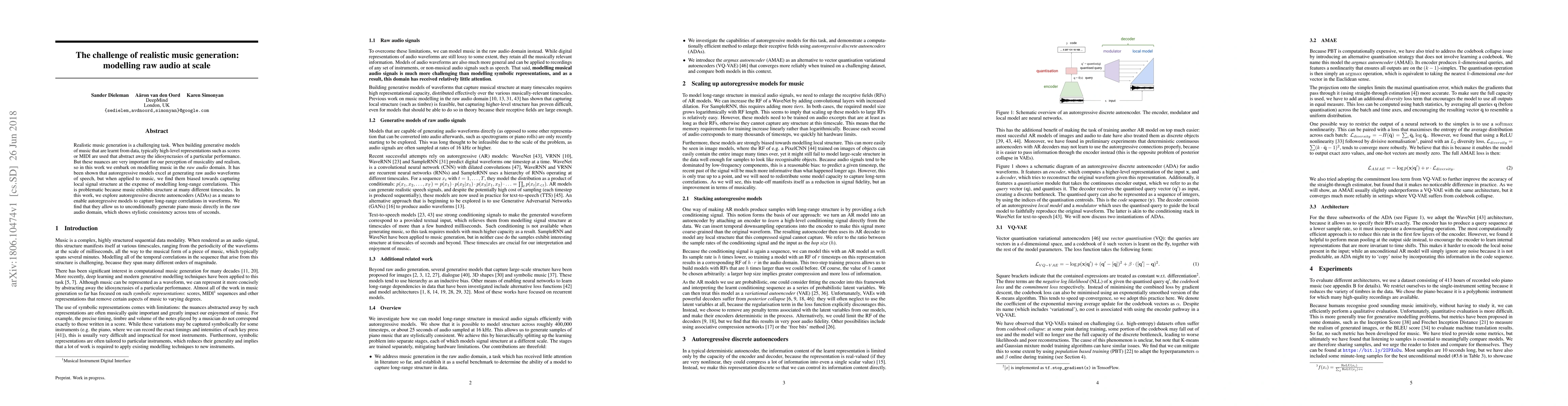 This paper investigates realistic music generation by modeling raw audio, addressing the limitations of high-level representations like MIDI. It proposes autoregressive discrete autoencoders (ADAs) to capture long-range correlations in music, enabling the generation of stylistically consistent piano music in the raw audio domain.