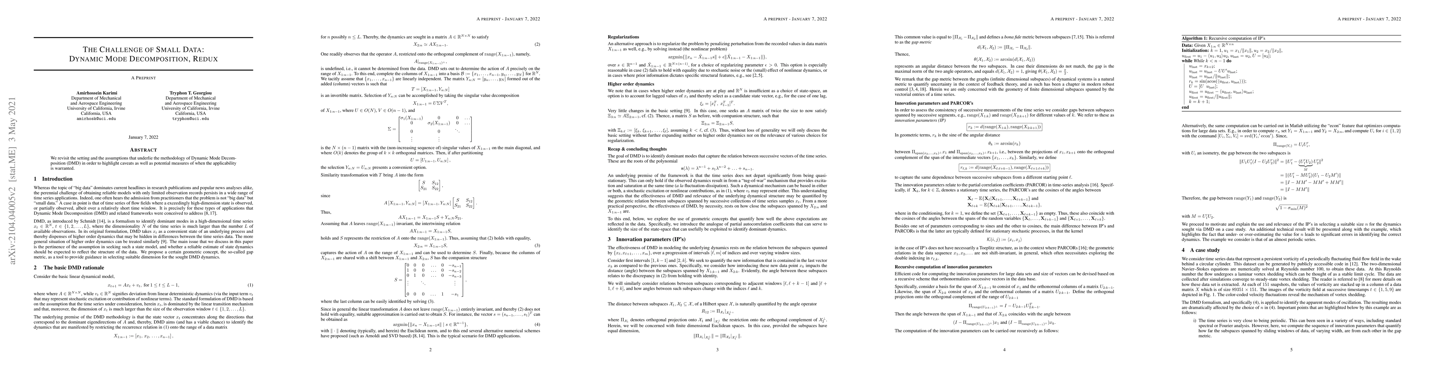 The paper revisits Dynamic Mode Decomposition (DMD) methodology, highlighting caveats and conditions for its applicability. It introduces regularization to address issues arising from stochastic noise, nonlinear dynamics, or small data samples, and explores higher-order dynamics by incorporating lagged values of xt as candidate state vectors.