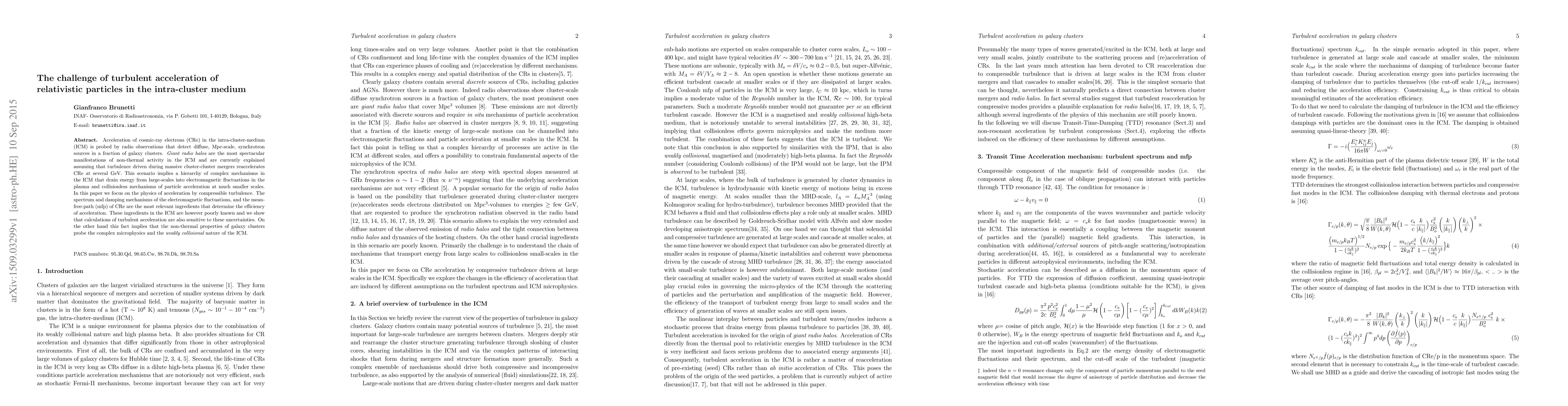 This paper investigates the turbulent acceleration of relativistic particles in the intra-cluster medium (ICM), focusing on the mechanisms that drive the reacceleration of cosmic-ray electrons. It highlights the uncertainties in the spectrum and damping of electromagnetic fluctuations, and the mean-free-path of cosmic rays, which critically affect the efficiency of acceleration and reveal the complex microphysics of the ICM.