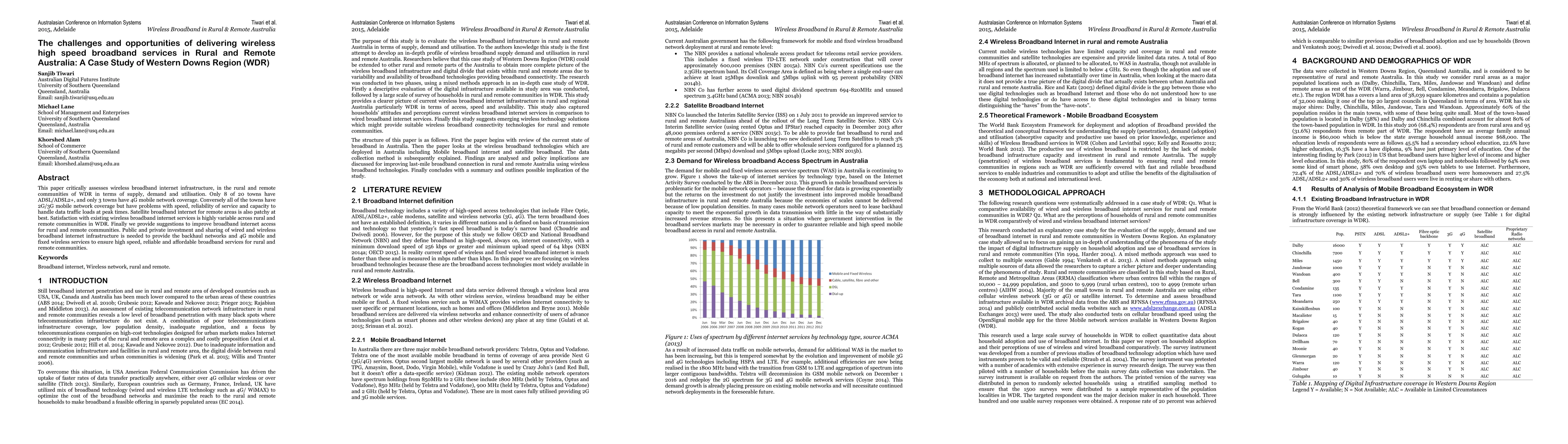 This paper examines the challenges and opportunities of providing wireless high-speed broadband in rural and remote Western Downs Region, highlighting the limited availability of ADSL and 4G services and the need for public and private investment to improve infrastructure and access. Recommendations include sharing broadband infrastructure to ensure reliable, high-speed, and affordable internet services.
