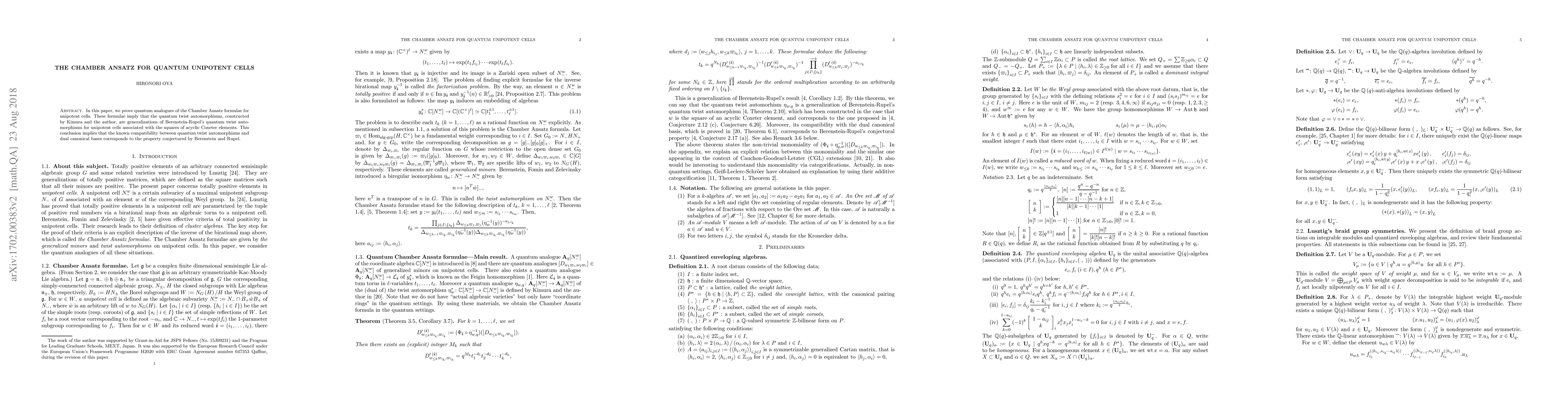 In this paper, we prove quantum analogues of the Chamber Ansatz formulae for unipotent cells. These formulae imply that the quantum twist automorphisms, constructed by Kimura and the author, are generalizations of Berenstein-Rupel's quantum twist automorphisms for unipotent cells associated with the squares of acyclic Coxeter elements. This conclusion implies that the known compatibility between quantum twist automorphisms and dual canonical bases corresponds to the property conjectured by Berenstein and Rupel.