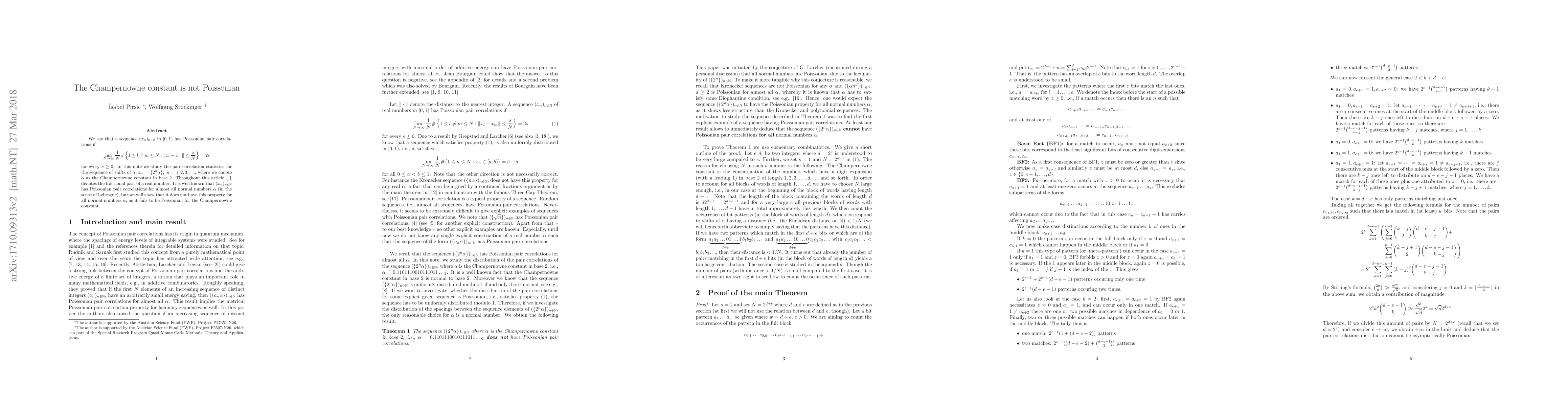 We say that a sequence $(x_n)_{n \in \mathbb{N}}$ in $[0,1)$ has Poissonian pair correlations if \begin{equation*} \lim_{N \to \infty} \frac{1}{N} \# \lbrace 1 \leq l \neq m \leq N: \| x_l - x_m \| \leq \frac{s}{N} \rbrace = 2s \end{equation*} for every $s \geq 0$. In this note we study the pair correlation statistics for the sequence of shifts of $\alpha$, $x_n = \lbrace 2^n \alpha \rbrace, \ n=1, 2, 3, \ldots$, where we choose $\alpha$ as the Champernowne constant in base $2$. Throughout this article $\lbrace \cdot \rbrace$ denotes the fractional part of a real number. It is well known that $(x_n)_{n \in \mathbb{N}}$ has Poissonian pair correlations for almost all normal numbers $\alpha$ (in the sense of Lebesgue), but we will show that it does not have this property for all normal numbers $\alpha$, as it fails to be Poissonian for the Champernowne constant.