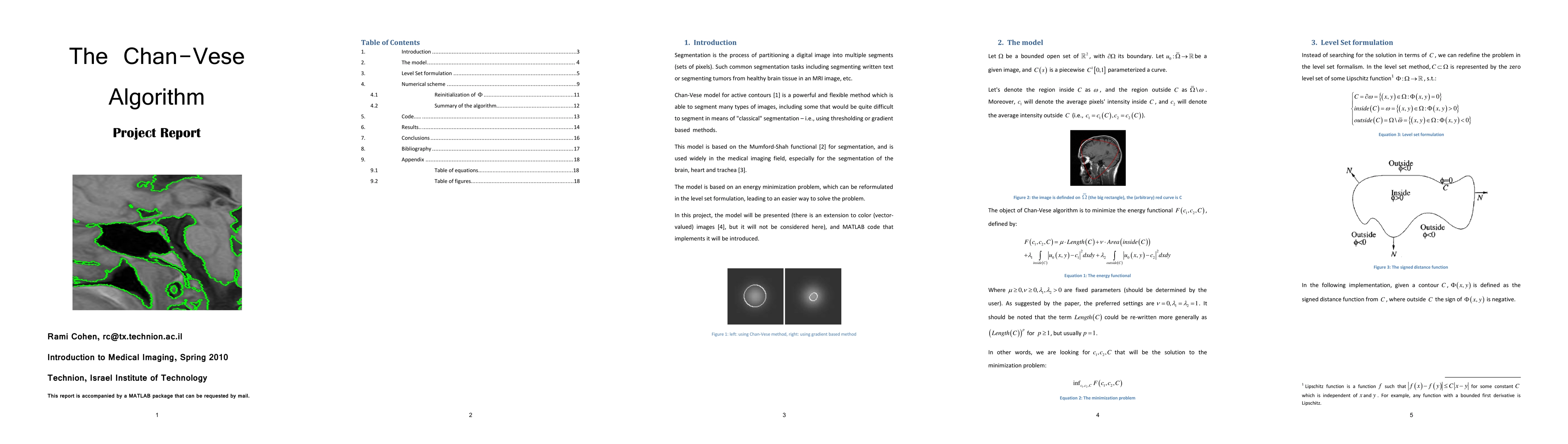 The Chan-Vese algorithm is a flexible active contour model for image segmentation based on the Mumford-Shah functional, widely used in medical imaging for segmenting complex structures like the brain and heart. The method is implemented in MATLAB and solves an energy minimization problem using a level set formulation.