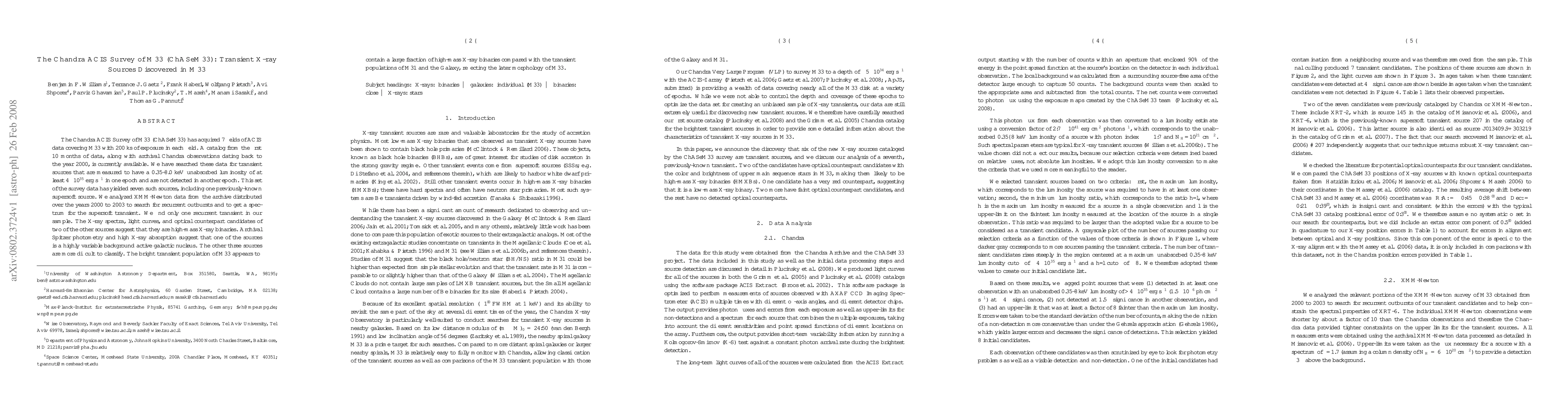 The Chandra ACIS Survey of M33 (ChASeM33) identified seven transient X-ray sources in M33, including one recurrent transient and several high-mass X-ray binaries, indicating a higher proportion of such binaries in M33 compared to M31 and the Galaxy. The survey utilized 200 ks of exposure data and archival observations from 2000 to 2003.