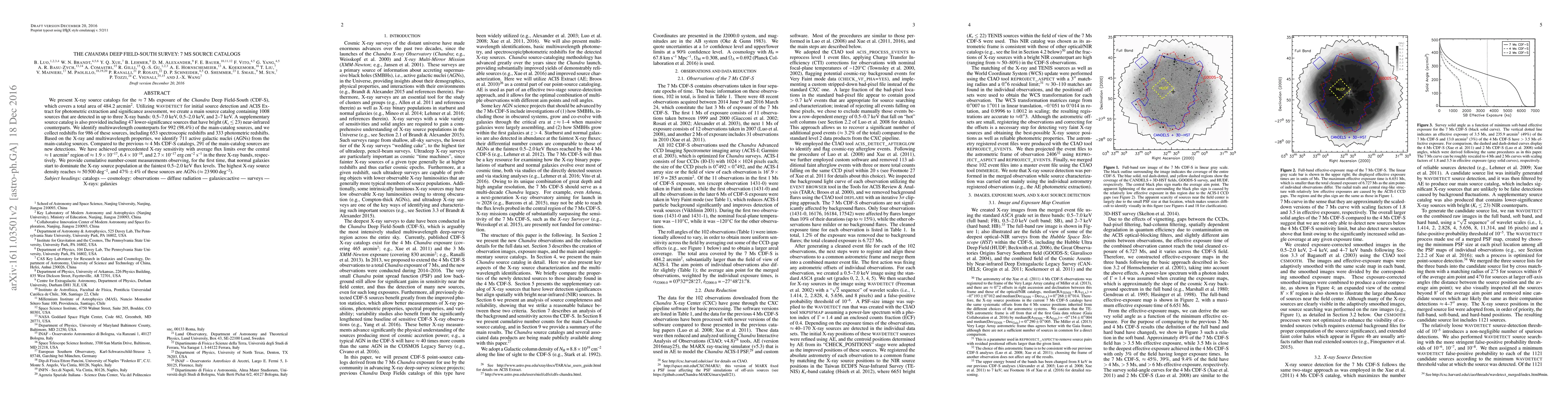 The Chandra Deep Field-South Survey presents X-ray source catalogs from a 7 Ms exposure, identifying 1008 main catalog sources and 47 supplementary sources, with 98.4% of main catalog sources matched to multiwavelength counterparts. This survey reveals unprecedented X-ray sensitivity, noting that normal galaxies dominate the faintest X-ray source population.