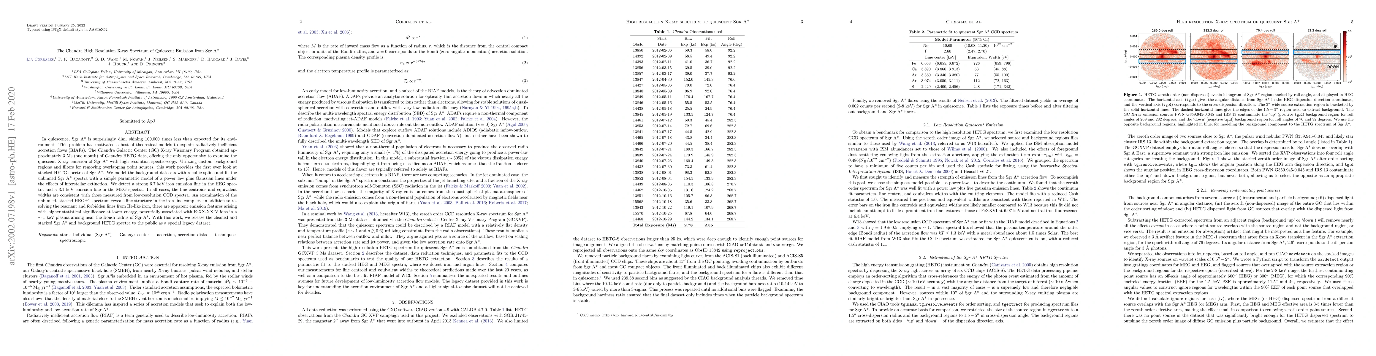 In quiescence, Sgr A* is surprisingly dim, shining 100,000 times less than expected for its environment. This problem has motivated a host of theoretical models to explain radiatively inefficient accretion flows (RIAFs). The Chandra Galactic Center (GC) X-ray Visionary Program obtained approximately 3 Ms (one month) of Chandra HETG data, offering the only opportunity to examine the quiescent X-ray emission of Sgr A* with high resolution spectroscopy. Utilizing custom background regions and filters for removing overlapping point sources, this work provides the first ever look at stacked HETG spectra of Sgr A*. We model the background datasets with a cubic spline and fit the unbinned Sgr A* spectra with a simple parametric model of a power law plus Gaussian lines under the effects of interstellar extinction. We detect a strong 6.7 keV iron emission line in the HEG spectra and a 3.1 keV emission line in the MEG spectra. In all cases, the line centroids and equivalent widths are consistent with those measured from low-resolution CCD spectra. An examination of the unbinned, stacked HEG+/-1 spectrum reveals fine structure in the iron line complex. In addition to resolving the resonant and forbidden lines from He-like iron, there are apparent emission features arising with higher statistical significance at lower energy, potentially associated with FeXX-XXIV ions in a ~1 keV plasma arising near the Bondi radius of Sgr A*. With this work, we release the cleaned and stacked Sgr A* and background HETG spectra to the public as a special legacy dataset.