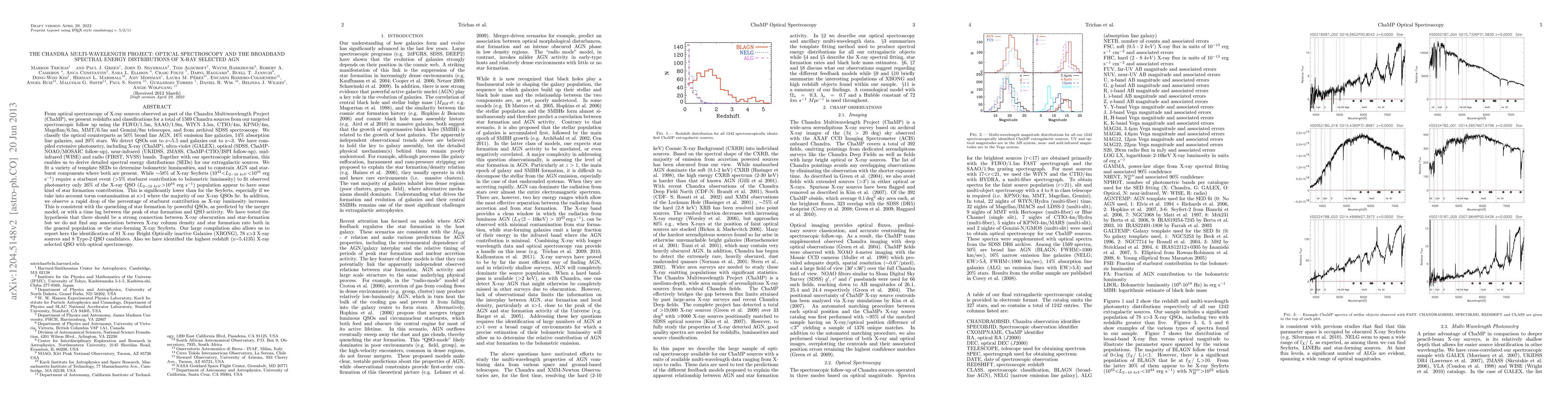 From optical spectroscopy of X-ray sources observed as part of ChaMP, we present redshifts and classifications for a total of 1569 Chandra sources from our targeted spectroscopic follow up using the FLWO, SAAO, WIYN, CTIO, KPNO, Magellan, MMT and Gemini telescopes, and from archival SDSS spectroscopy. We classify the optical counterparts as 50% BLAGN, 16% NELG, 14% ALG, and 20% stars. We detect QSOs out to z~5.5 and galaxies out to z~3. We have compiled extensive photometry from X-ray to radio bands. Together with our spectroscopic information, this enables us to derive detailed SEDs for our extragalactic sources. We fit a variety of templates to determine bolometric luminosities, and to constrain AGN and starburst components where both are present. While ~58% of X-ray Seyferts require a starburst event to fit observed photometry only 26% of the X-ray QSO population appear to have some kind of star formation contribution. This is significantly lower than for the Seyferts, especially if we take into account torus contamination at z>1 where the majority of our X-ray QSOs lie. In addition, we observe a rapid drop of the percentage of starburst contribution as X-ray luminosity increases. This is consistent with the quenching of star formation by powerful QSOs, as predicted by the merger model, or with a time lag between the peak of star formation and QSO activity. We have tested the hypothesis that there should be a strong connection between X-ray obscuration and star-formation but we do not find any association between X-ray column density and star formation rate both in the general population or the star-forming X-ray Seyferts. Our large compilation also allows us to report here the identification of 81 XBONG, 78 z>3 X-ray sources and 8 Type-2 QSO candidates. Also we have identified the highest redshift (z=5.4135) X-ray selected QSO with optical spectroscopy.