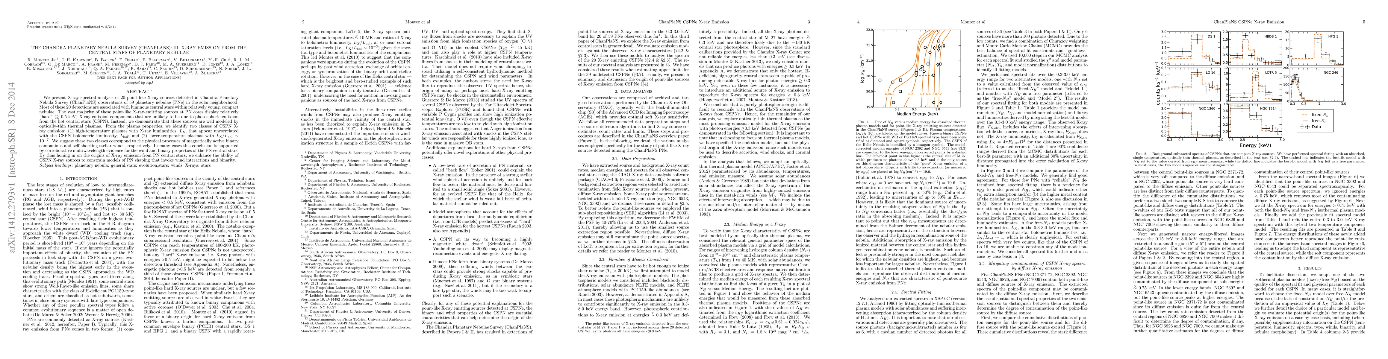 This paper analyzes X-ray emissions from central stars of planetary nebulae (CSPN) using Chandra data, identifying two classes of X-ray sources based on plasma properties. The findings suggest that the X-ray emissions are likely due to magnetically active binary companions or self-shocking stellar winds, providing insights into the physical processes shaping planetary nebulae.