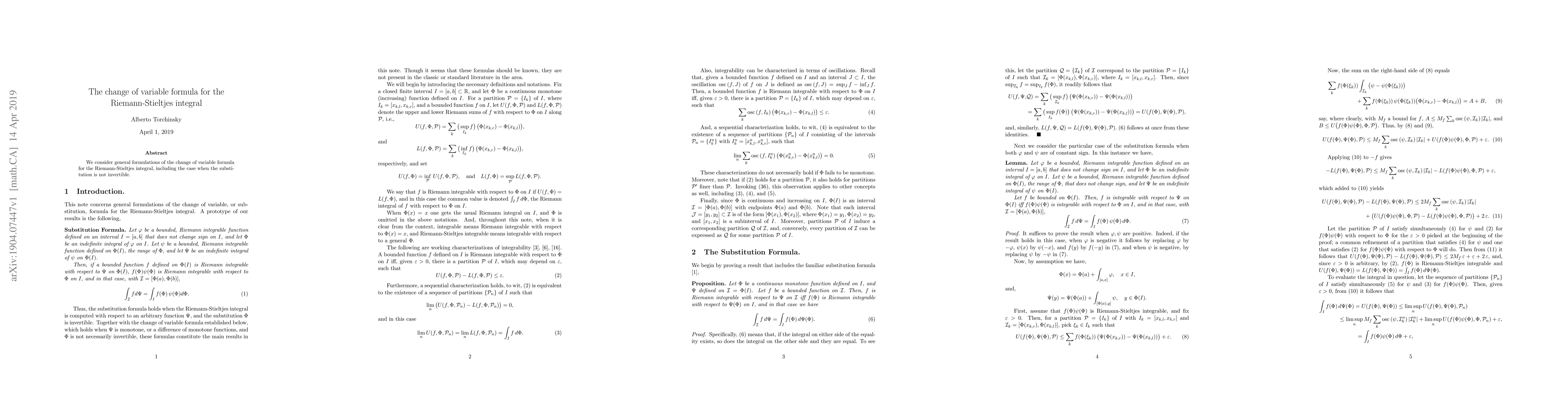 Summary: This paper explores generalized change of variable formulas for Riemann-Stieltjes integrals, addressing scenarios where the substitution function is not invertible, extending the applicability of the transformation technique.