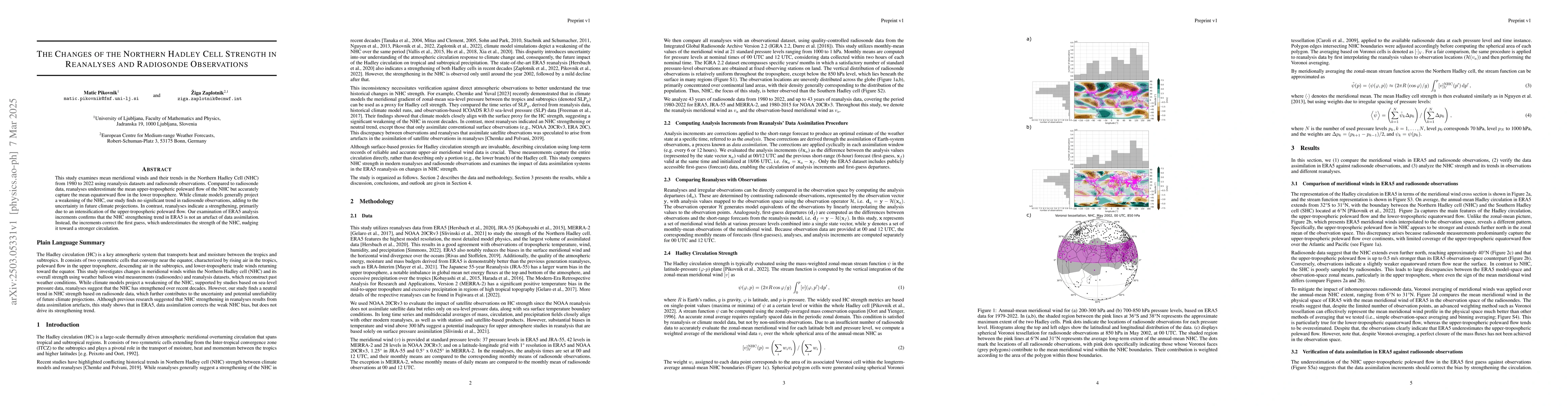 The study introduces a robust method for evaluating NHC strength and trends by comparing meridional wind data from modern reanalyses with radiosonde observations, using Voronoi tesselation for averaging over the NHC region.