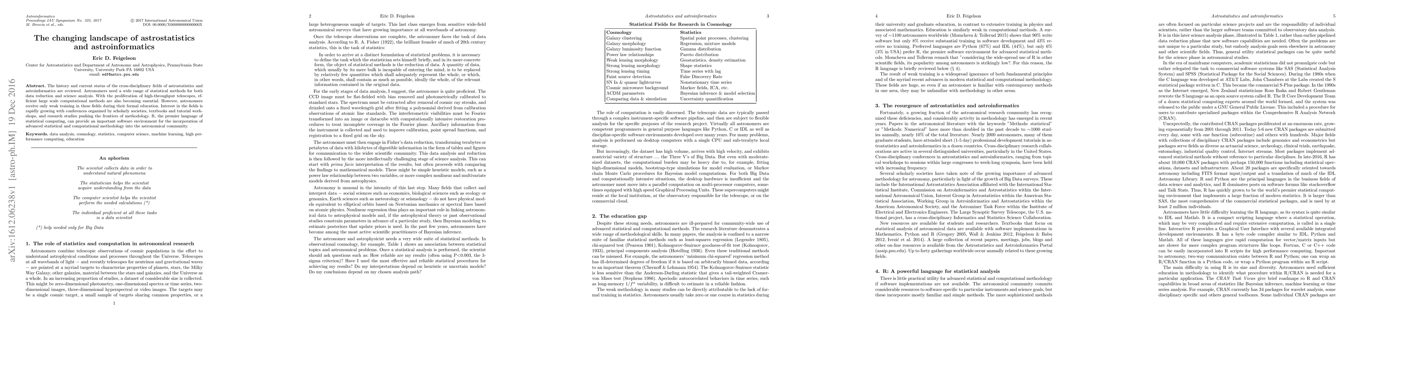The history and current status of the cross-disciplinary fields of astrostatistics and astroinformatics are reviewed. Astronomers need a wide range of statistical methods for both data reduction and science analysis. With the proliferation of high-throughput telescopes, efficient large scale computational methods are also becoming essential. However, astronomers receive only weak training in these fields during their formal education. Interest in the fields is rapidly growing with conferences organized by scholarly societies, textbooks and tutorial workshops, and research studies pushing the frontiers of methodology. R, the premier language of statistical computing, can provide an important software environment for the incorporation of advanced statistical and computational methodology into the astronomical community.