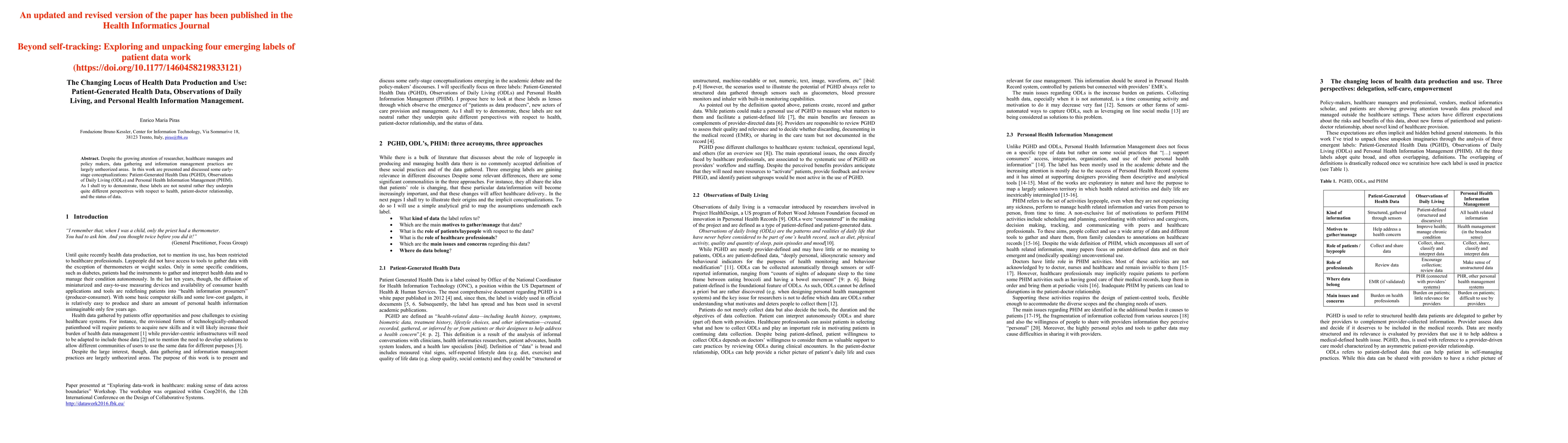 Despite the growing attention of researcher, healthcare managers and policy makers, data gathering and information management practices are largely untheorized areas. In this work are presented and discussed some early-stage conceptualizations: Patient-Generated Health Data (PGHD), Observations of Daily Living (ODLs) and Personal Health Information Management (PHIM). As I shall try to demonstrate, these labels are not neutral rather they underpin quite different perspectives with respect to health, patient-doctor relationship, and the status of data.
