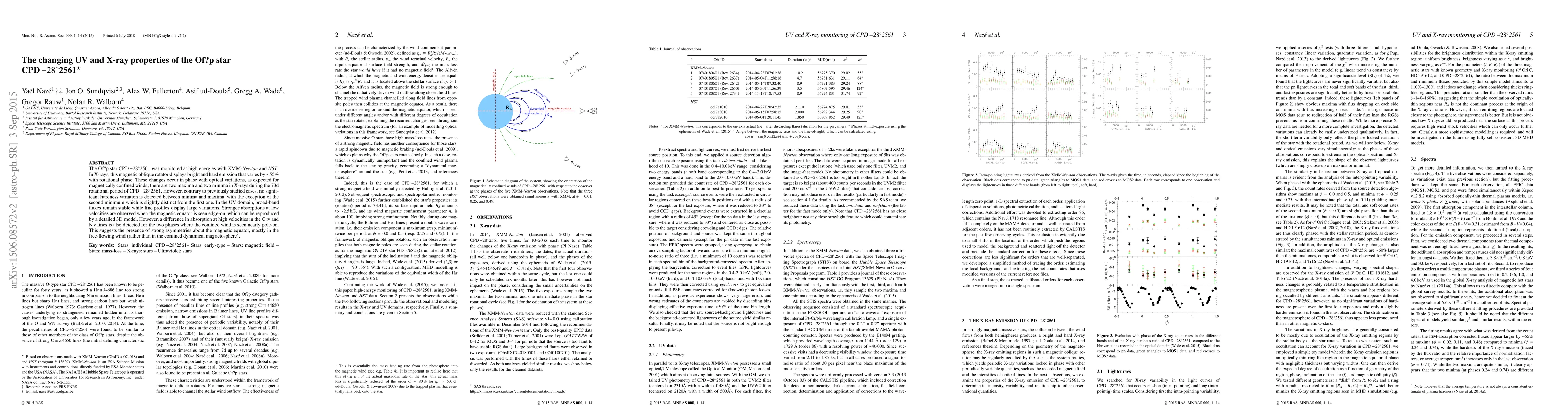The Of?p star CPD -28 2561 was monitored at high energies with XMM-Newton and HST. In X-rays, this magnetic oblique rotator displays bright and hard emission that varies by ~55% with rotational phase. These changes occur in phase with optical variations, as expected for magnetically confined winds; there are two maxima and two minima in X-rays during the 73d rotational period of CPD -28 2561. However, contrary to previously studied cases, no significant hardness variation is detected between minima and maxima, with the exception of the second minimum which is slightly distinct from the first one. In the UV domain, broad-band fluxes remain stable while line profiles display large variations. Stronger absorptions at low velocities are observed when the magnetic equator is seen edge-on, which can be reproduced by a detailed 3D model. However, a difference in absorption at high velocities in the CIV and NV lines is also detected for the two phases where the confined wind is seen nearly pole-on. This suggests the presence of strong asymmetries about the magnetic equator, mostly in the free-flowing wind (rather than in the confined dynamical magnetosphere).