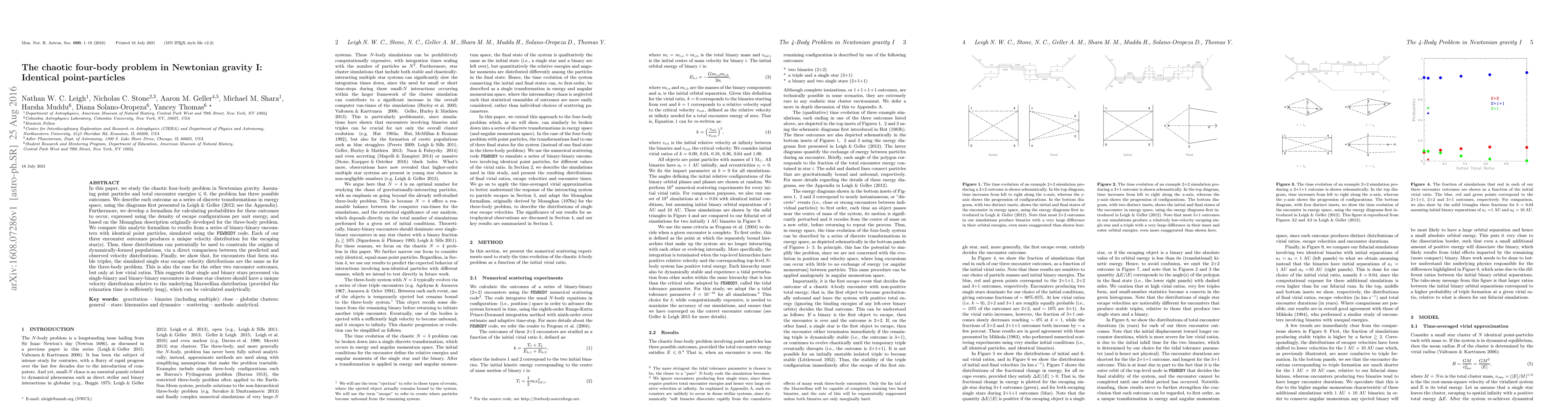 This paper investigates the chaotic four-body problem in Newtonian gravity with identical point particles, detailing three possible outcomes through energy transformations and developing a formalism to calculate their probabilities. The study compares analytic results with simulations, revealing unique velocity distributions for the outcomes that can constrain the origins of dynamically-formed populations.