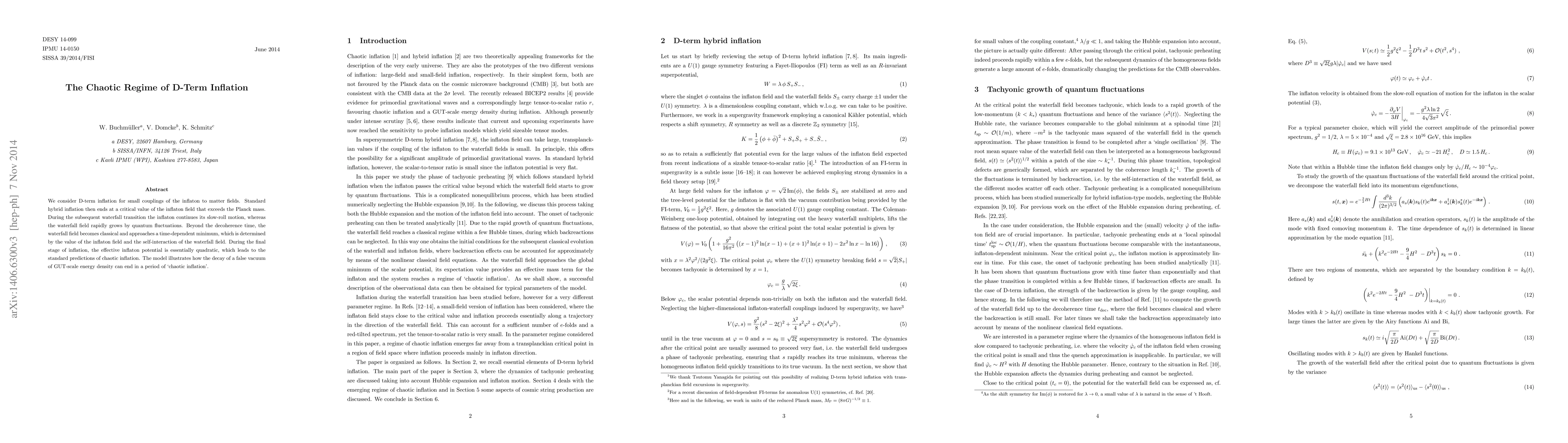 This paper explores D-term inflation where the inflaton field's coupling to matter fields is small, leading to a chaotic inflationary regime. The transition from hybrid to chaotic inflation occurs via a waterfall field's quantum fluctuations, ultimately resulting in standard chaotic inflation predictions.