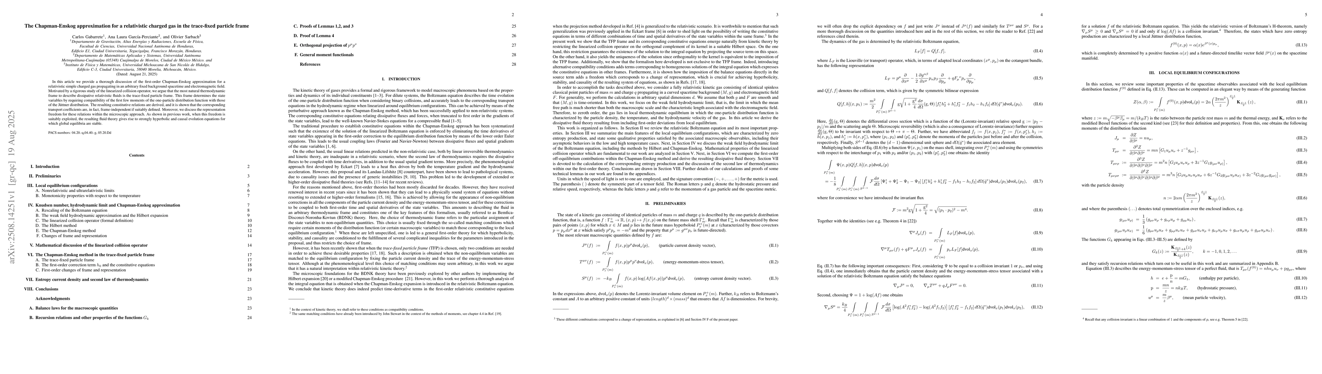 This research employs a Chapman-Enskog approximation for a relativistic simple charged gas, focusing on the trace-fixed particle frame. It rigorously studies the linearized collision operator to argue for the trace-fixed particle frame as the natural thermodynamic frame for dissipative relativistic fluids.