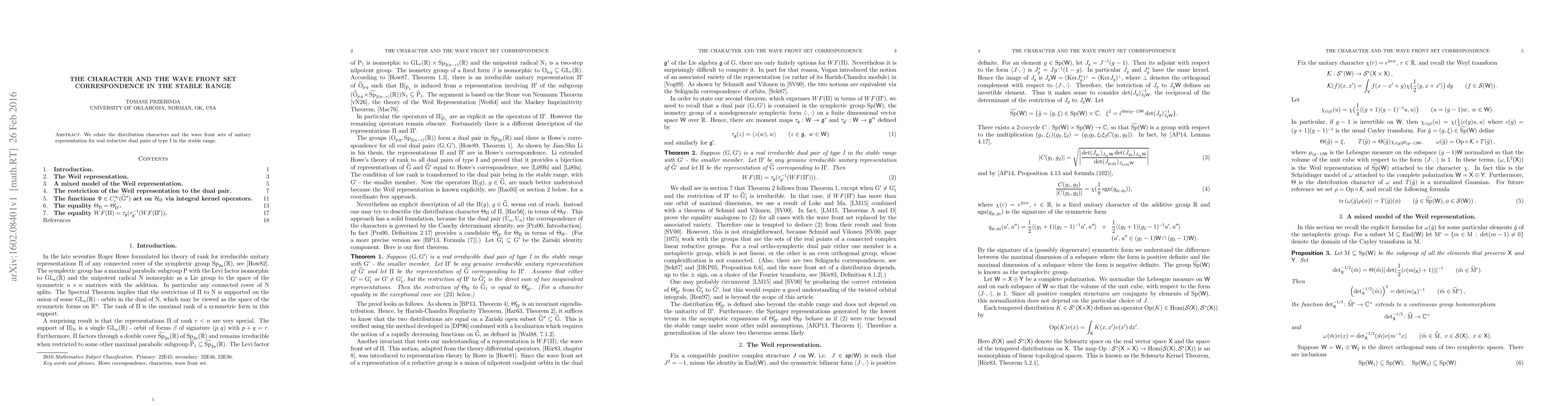 Summary: This paper establishes a correspondence between the distribution characters and the wave front sets for unitary representations of real reductive dual pairs of type I within the stable range, elucidating their intrinsic mathematical relationships.