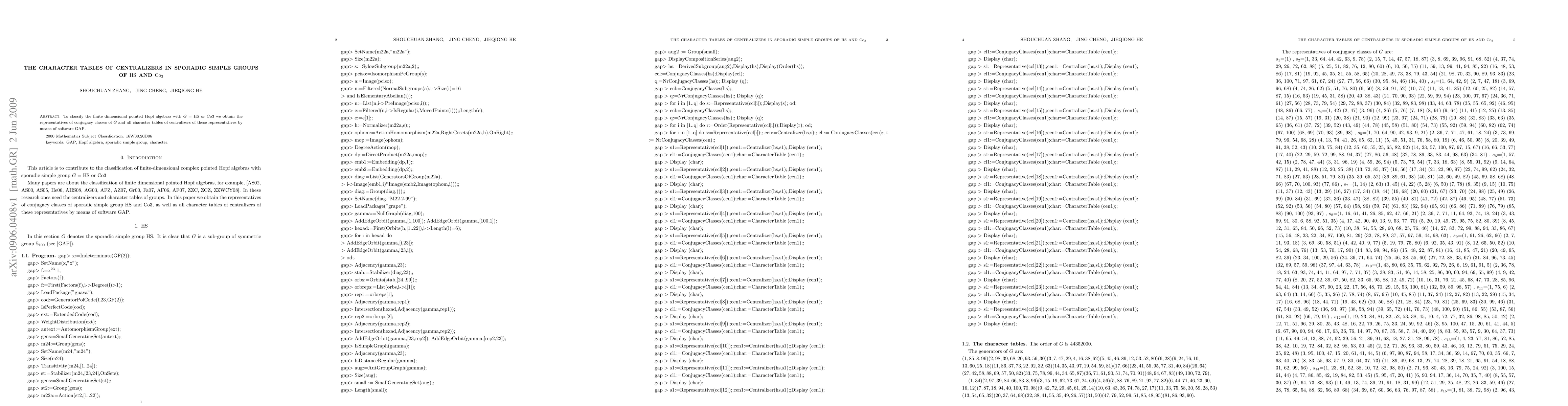 To classify the finite dimensional pointed Hopf algebras with $G= {\rm HS}$ or ${\rm Co3}$ we obtain the representatives of conjugacy classes of $G$ and all character tables of centralizers of these representatives by means of software {\rm GAP}.