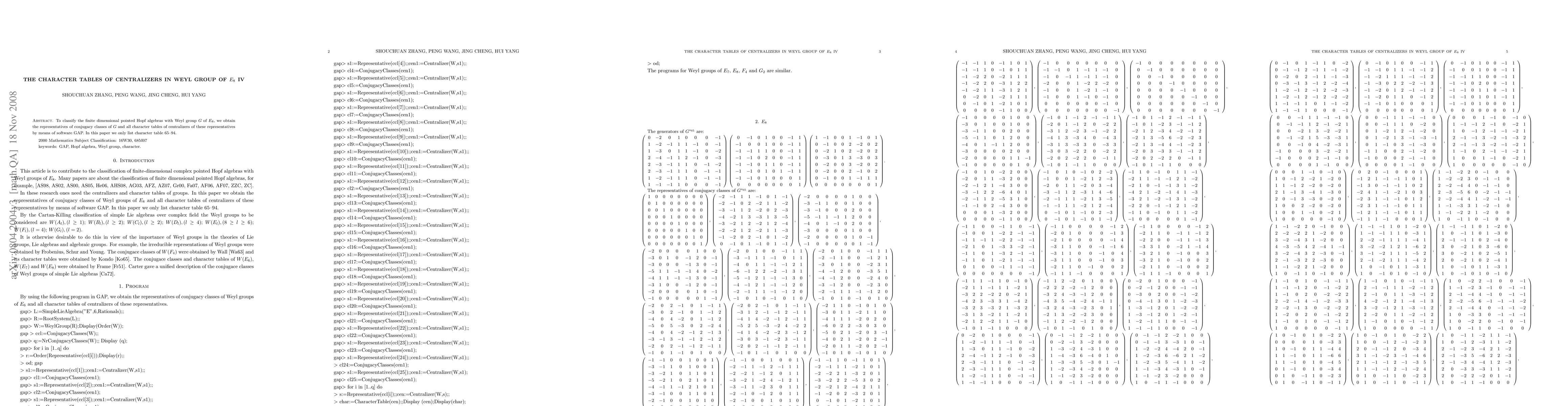 To classify the finite dimensional pointed Hopf algebras with Weyl group $G$ of $E_8$, we obtain the representatives of conjugacy classes of $G$ and all character tables of centralizers of these representatives by means of software GAP. In this paper we only list character table 65--94.
