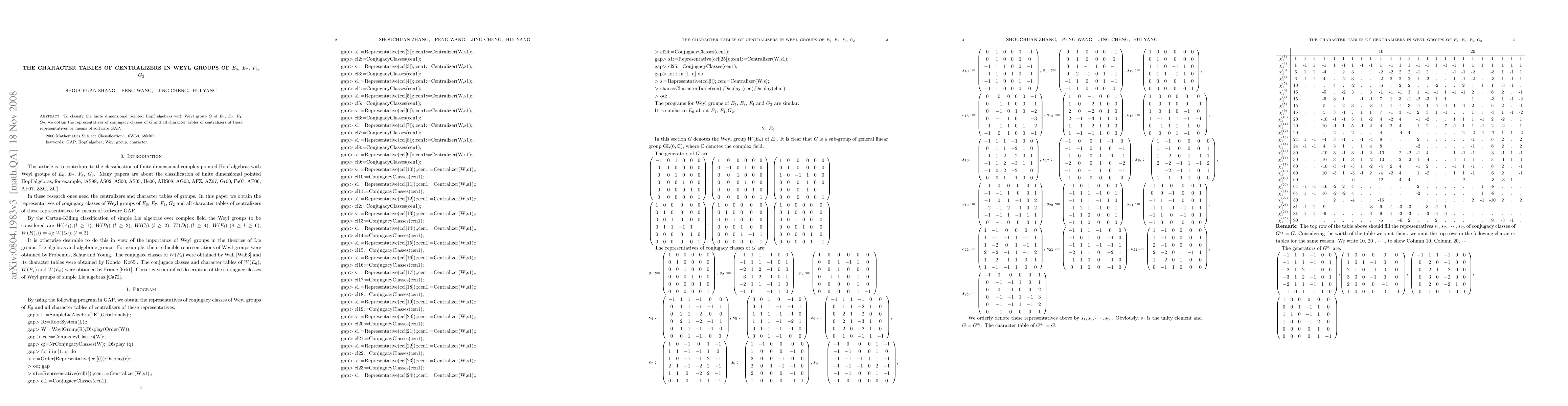 To classify the finite dimensional pointed Hopf algebras with Weyl group $G$ of $E_6$, $E_7$, $F_4$, $G_2$, we obtain the representatives of conjugacy classes of $G$ and all character tables of centralizers of these representatives by means of software GAP.
