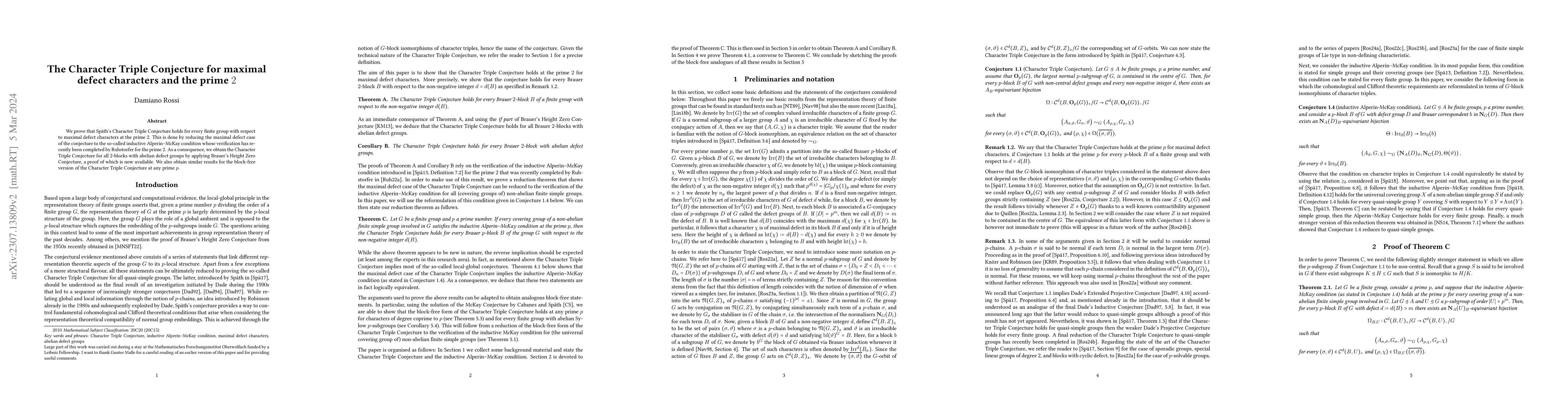 Summary: This paper proves Späh's Character Triple Conjecture for finite groups concerning maximal defect characters at the prime 2, using the inductive Alperin-McKay condition and applying Brauer's Height Zero Conjecture, thereby confirming the conjecture for all 2-blocks with abelian defect groups. Similar results are achieved for the block-free version at any prime p.