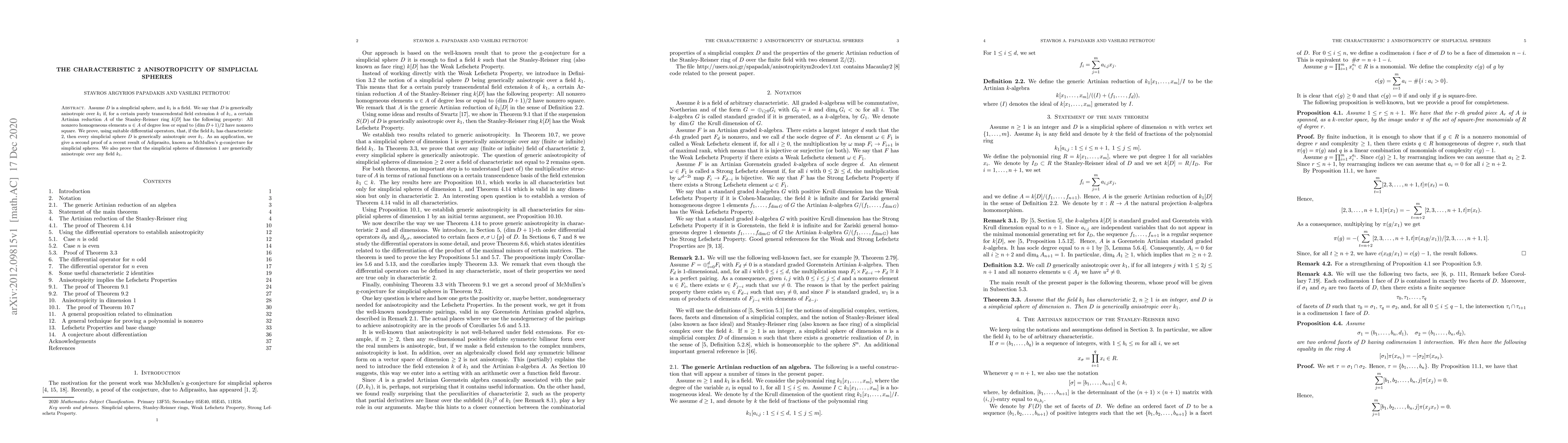 Assume D is a simplicial sphere, and k_1 is a field. We say that D is generically anisotropic over k_1 if, for a certain purely transcendental field extension k of k_1, a certain Artinian reduction A of the Stanley-Reisner ring k[D] has the following property: All nonzero homogeneous elements u of A of degree less or equal to (dim D +1)/2 have nonzero square. We prove, using suitable differential operators, that, if the field k_1 has characteristic 2, then every simplicial sphere D is generically anisotropic over k_1. As an application, we give a second proof of a recent result of Adiprasito, known as McMullen's g-conjecture for simplicial spheres. We also prove that the simplicial spheres of dimension 1 are generically anisotropic over any field k_1.