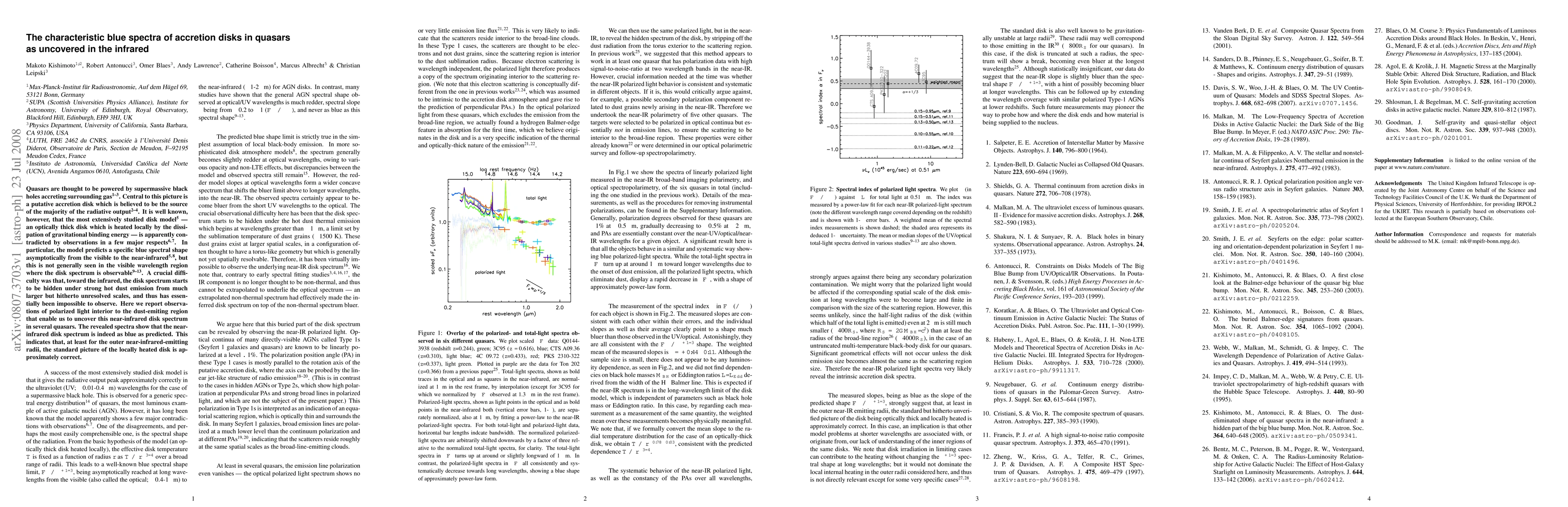 Quasars are thought to be powered by supermassive black holes accreting surrounding gas. Central to this picture is a putative accretion disk which is believed to be the source of the majority of the radiative output. It is well known, however, that the most extensively studied disk model -- an optically thick disk which is heated locally by the dissipation of gravitational binding energy -- is apparently contradicted by observations in a few major respects. In particular, the model predicts a specific blue spectral shape asymptotically from the visible to the near-infrared, but this is not generally seen in the visible wavelength region where the disk spectrum is observable. A crucial difficulty was that, toward the infrared, the disk spectrum starts to be hidden under strong hot dust emission from much larger but hitherto unresolved scales, and thus has essentially been impossible to observe. Here we report observations of polarized light interior to the dust-emiting region that enable us to uncover this near-infrared disk spectrum in several quasars. The revealed spectra show that the near-infrared disk spectrum is indeed as blue as predicted. This indicates that, at least for the outer near-infrared-emitting radii, the standard picture of the locally heated disk is approximately correct. The model problems at shorter wavelengths should then be directed toward a better understanding of the inner parts of the revealed disk. The newly uncovered disk emission at large radii, with more future measurements, will also shed totally new light on the unanswered critical question of how and where the disk ends.