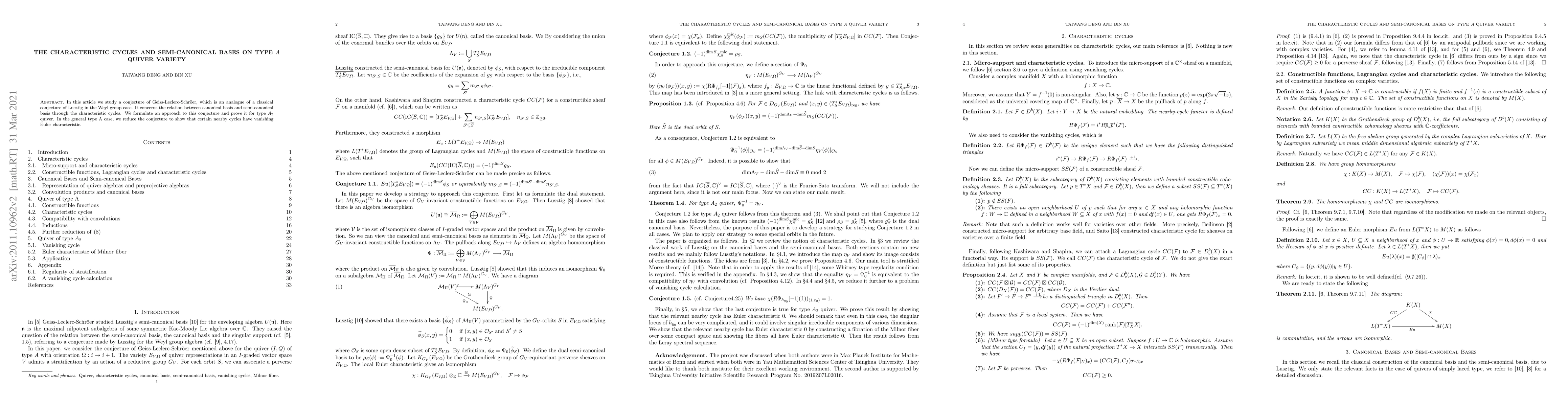 In this article we study a conjecture of Geiss-Leclerc-Schr{\"o}er, which is an analogue of a classical conjecture of Lusztig in the Weyl group case. It concerns the relation between canonical basis and semi-canonical basis through the characteristic cycles. We formulate an approach to this conjecture and prove it for type $A_2$ quiver. In general type A case, we reduce the conjecture to show that certain nearby cycles have vanishing Euler characteristic.