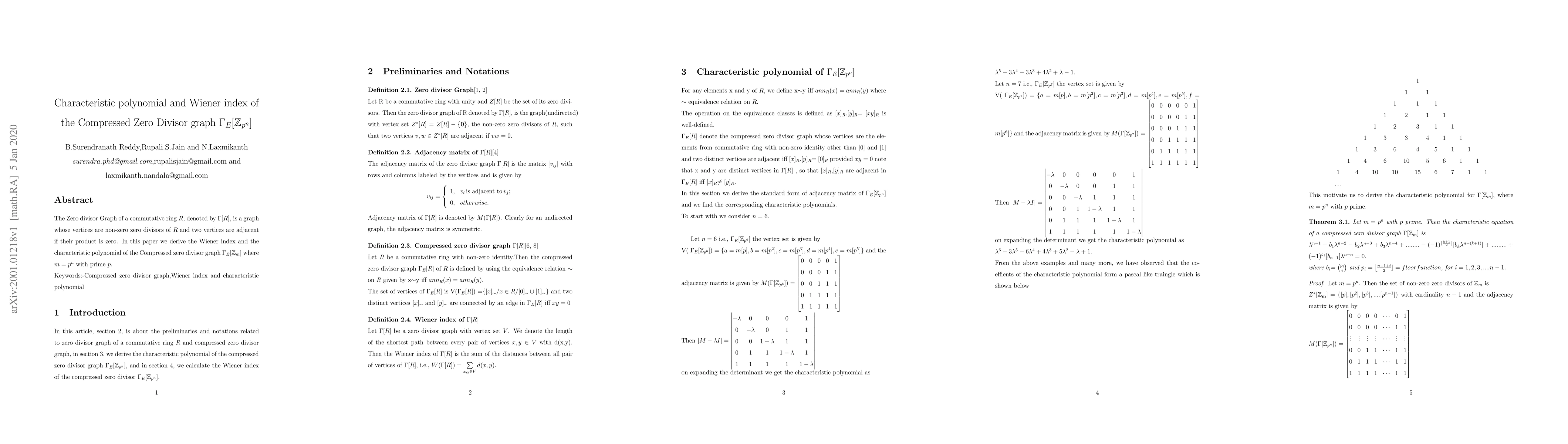 This paper derives the characteristic polynomial and Wiener index of the compressed zero divisor graph $\Gamma_E[\mathbb{Z}_m]$ for $m=p^n$, where $p$ is a prime. It focuses on the structural properties of this graph, which represents equivalence classes of zero divisors in the ring $\mathbb{Z}_m$.
