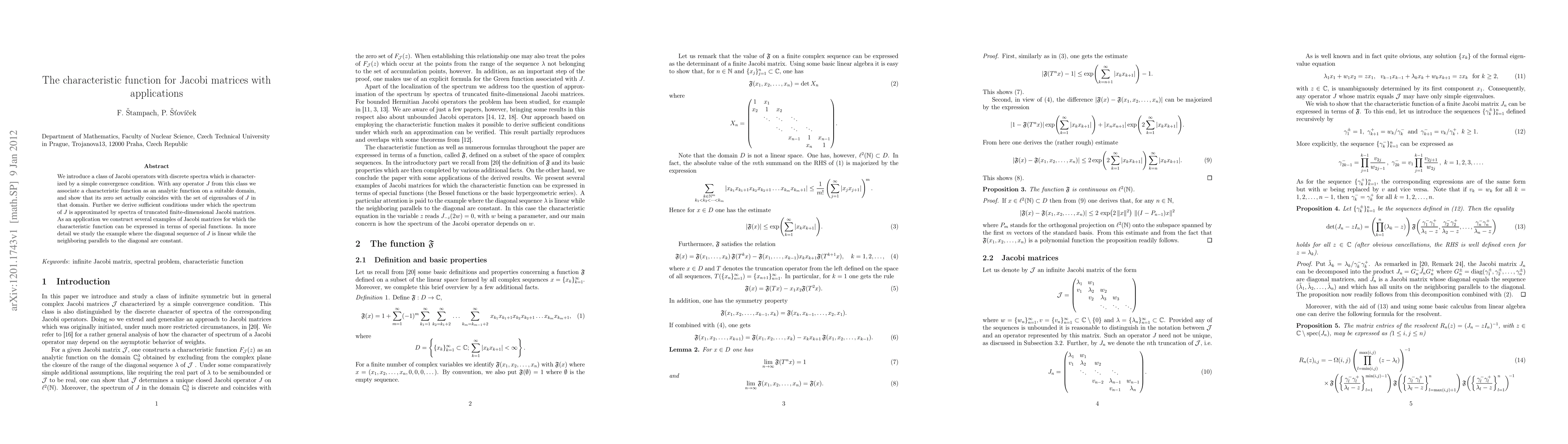 We introduce a class of Jacobi operators with discrete spectra which is characterized by a simple convergence condition. With any operator J from this class we associate a characteristic function as an analytic function on a suitable domain, and show that its zero set actually coincides with the set of eigenvalues of J in that domain. Further we derive sufficient conditions under which the spectrum of J is approximated by spectra of truncated finite-dimensional Jacobi matrices. As an application we construct several examples of Jacobi matrices for which the characteristic function can be expressed in terms of special functions. In more detail we study the example where the diagonal sequence of J is linear while the neighboring parallels to the diagonal are constant.