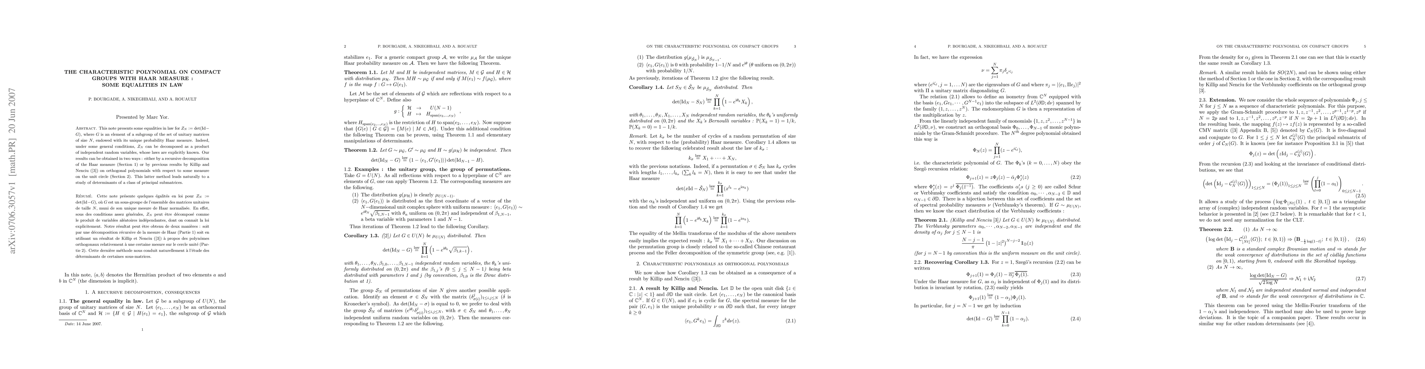 This note presents some equalities in law for $Z_N:=\det(\Id-G)$, where $G$ is an element of a subgroup of the set of unitary matrices of size $N$, endowed with its unique probability Haar measure. Indeed, under some general conditions, $Z_N$ can be decomposed as a product of independent random variables, whose laws are explicitly known. Our results can be obtained in two ways : either by a recursive decomposition of the Haar measure or by previous results by Killip and Nenciu on orthogonal polynomials with respect to some measure on the unit circle. This latter method leads naturally to a study of determinants of a class of principal submatrices.
