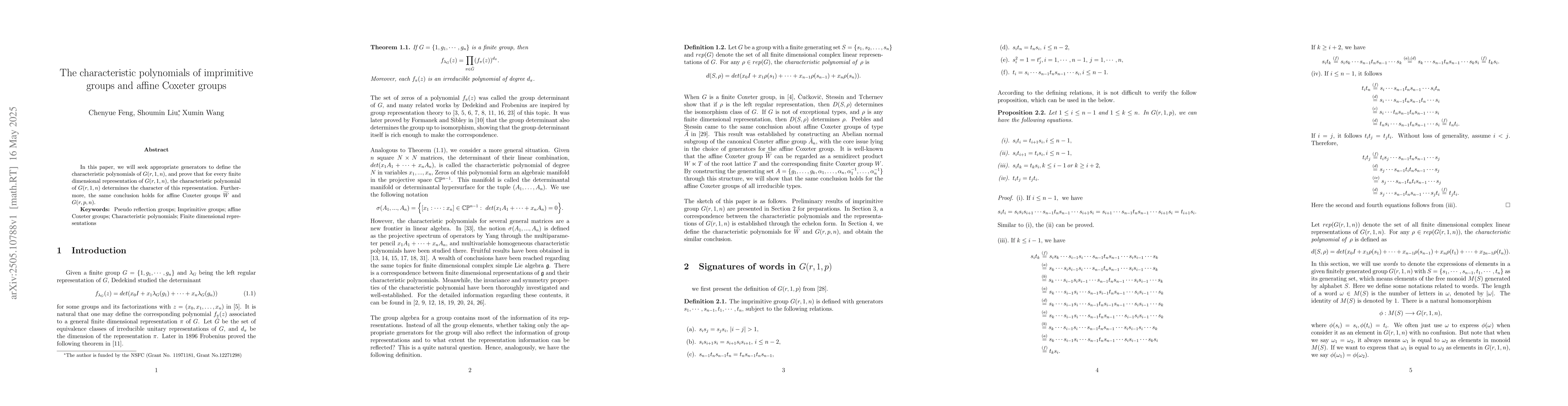 The paper seeks appropriate generators to define characteristic polynomials for G(r,1,n) and extends the findings to affine Coxeter groups and G(r,p,n).