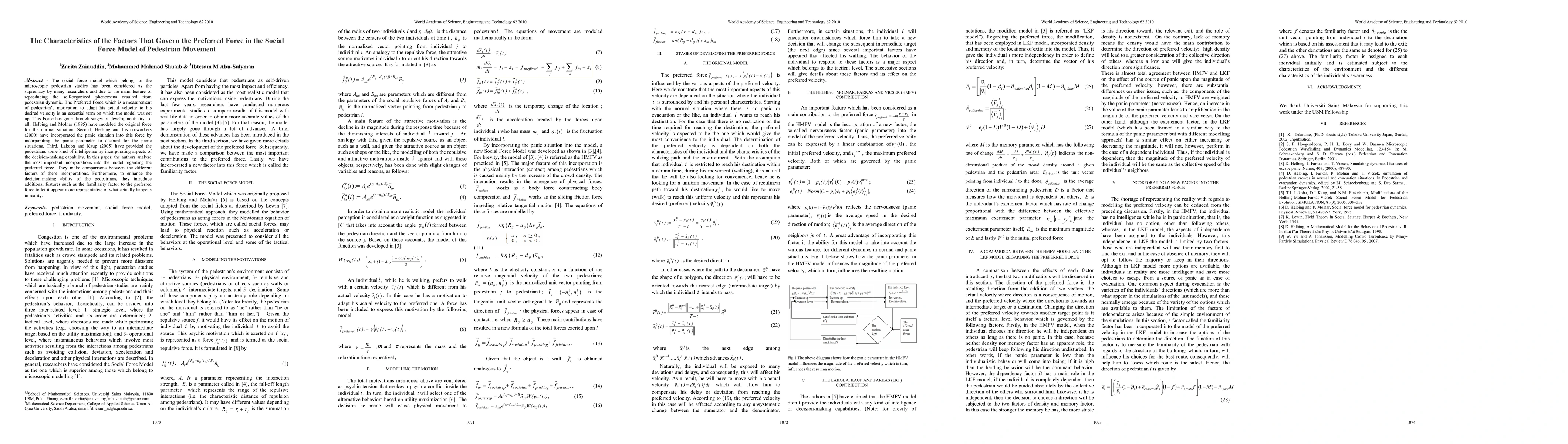The social force model which belongs to the microscopic pedestrian studies has been considered as the supremacy by many researchers and due to the main feature of reproducing the self-organized phenomena resulted from pedestrian dynamic. The Preferred Force which is a measurement of pedestrian's motivation to adapt his actual velocity to his desired velocity is an essential term on which the model was set up. This Force has gone through stages of development: first of all, Helbing and Molnar (1995) have modeled the original force for the normal situation. Second, Helbing and his co-workers (2000) have incorporated the panic situation into this force by incorporating the panic parameter to account for the panic situations. Third, Lakoba and Kaup (2005) have provided the pedestrians some kind of intelligence by incorporating aspects of the decision-making capability. In this paper, the authors analyze the most important incorporations into the model regarding the preferred force. They make comparisons between the different factors of these incorporations. Furthermore, to enhance the decision-making ability of the pedestrians, they introduce additional features such as the familiarity factor to the preferred force to let it appear more representative of what actually happens in reality.