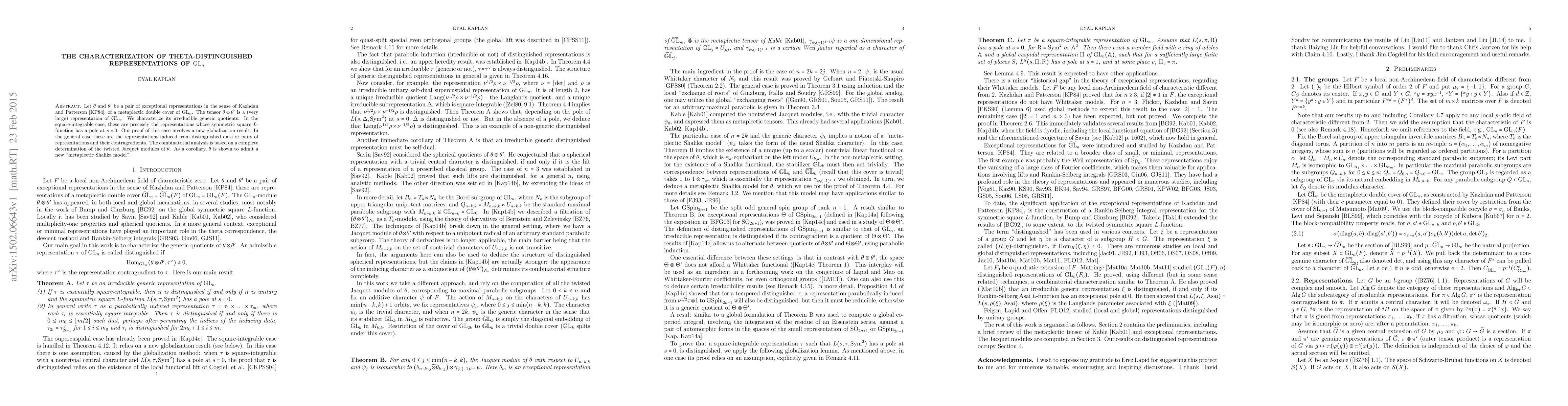Let $\theta$ and $\theta'$ be a pair of exceptional representations in the sense of Kazhdan and Patterson [KP], of a metaplectic double cover of $GL_n$. The tensor $\theta\otimes\theta'$ is a (very large) representation of $GL_n$. We characterize its irreducible generic quotients. In the square-integrable case, these are precisely the representations whose symmetric square L-function has a pole at s=0. Our proof of this case involves a new globalization result. In the general case these are the representations induced from distinguished data or pairs of representations and their contragradients. The combinatorial analysis is based on a complete determination of the twisted Jacquet modules of $\theta$. As a corollary, $\theta$ is shown to admit a new "metaplectic Shalika model".