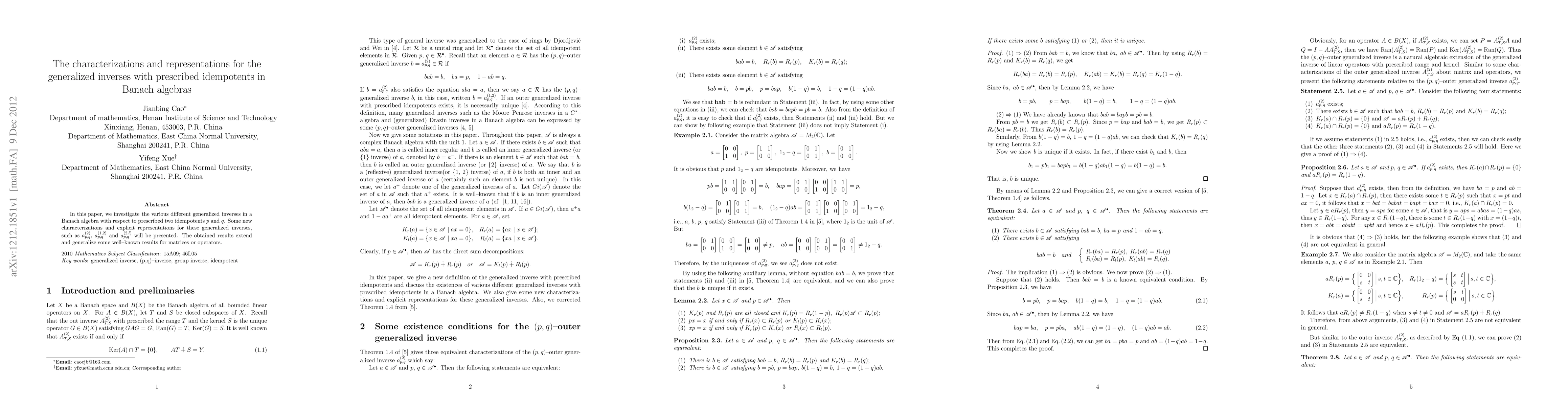 The paper introduces novel definitions and equivalence conditions for generalized inverses with prescribed idempotents in Banach algebras, extending previous work on matrix and operator inverses.