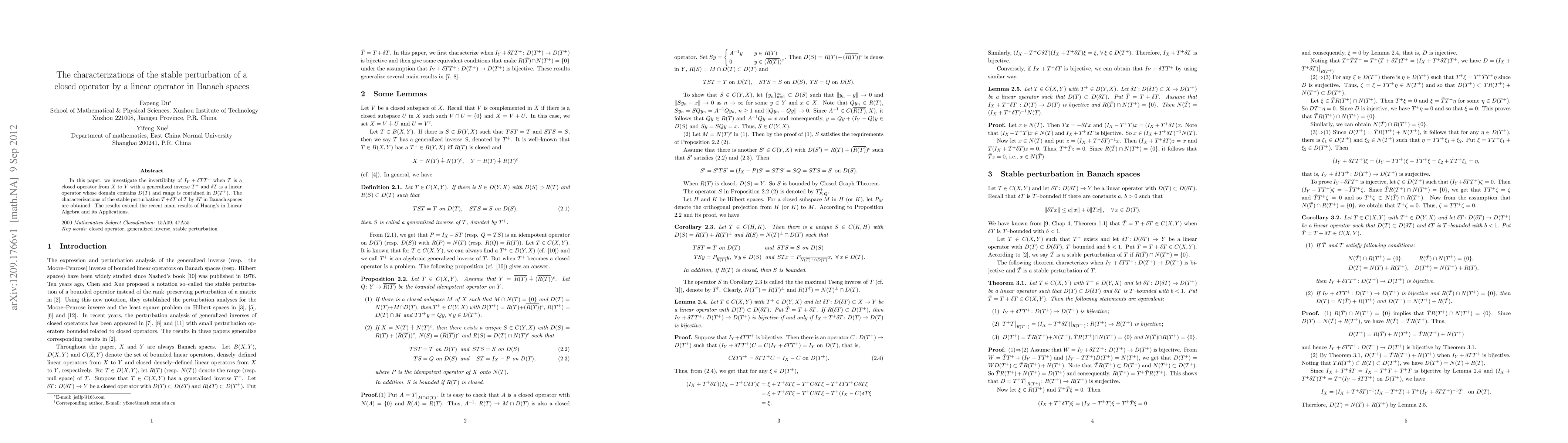 This paper explores the invertibility conditions for $I_Y+\delta TT^+$ when $T$ is a closed operator with a generalized inverse $T^+$ and $\delta T$ is a linear operator. It provides characterizations for the stable perturbation $T+\delta T$ in Banach spaces, extending recent findings by Huang in Linear Algebra and its Applications.