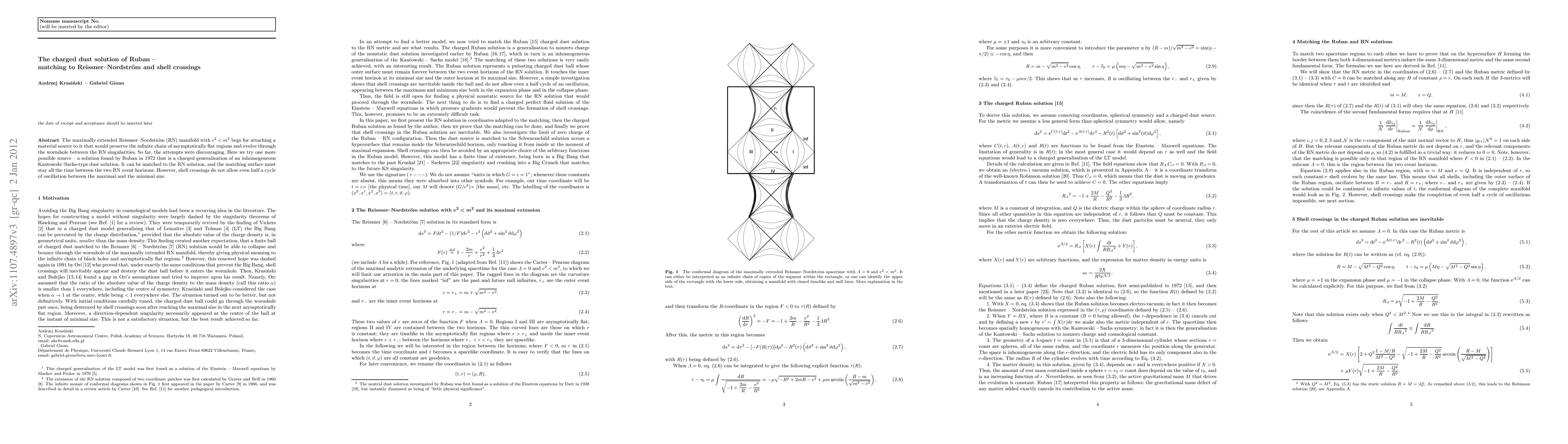 The maximally extended Reissner--Nordstr\"om (RN) manifold with $e^2 < m^2$ begs for attaching a material source to it that would preserve the infinite chain of asymptotically flat regions and evolve through the wormhole between the RN singularities. So far, the attempts were discouraging. Here we try one more possible source -- a solution found by Ruban in 1972 that is a charged generalisation of an inhomogeneous Kantowski--Sachs-type dust solution. It can be matched to the RN solution, and the matching surface must stay all the time between the two RN event horizons. However, shell crossings do not allow even half a cycle of oscillation between the maximal and the minimal size.