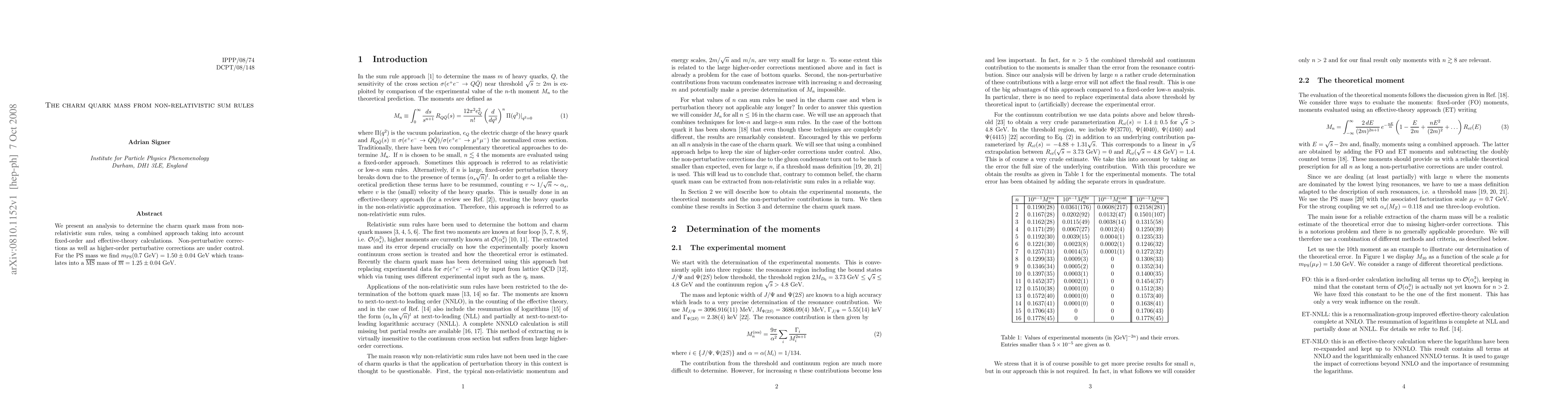 This paper determines the charm quark mass using non-relativistic sum rules, combining fixed-order and effective-theory calculations. The analysis yields a PS mass of 1.50±0.04 GeV, translating to an MS-bar mass of 1.25±0.04 GeV.