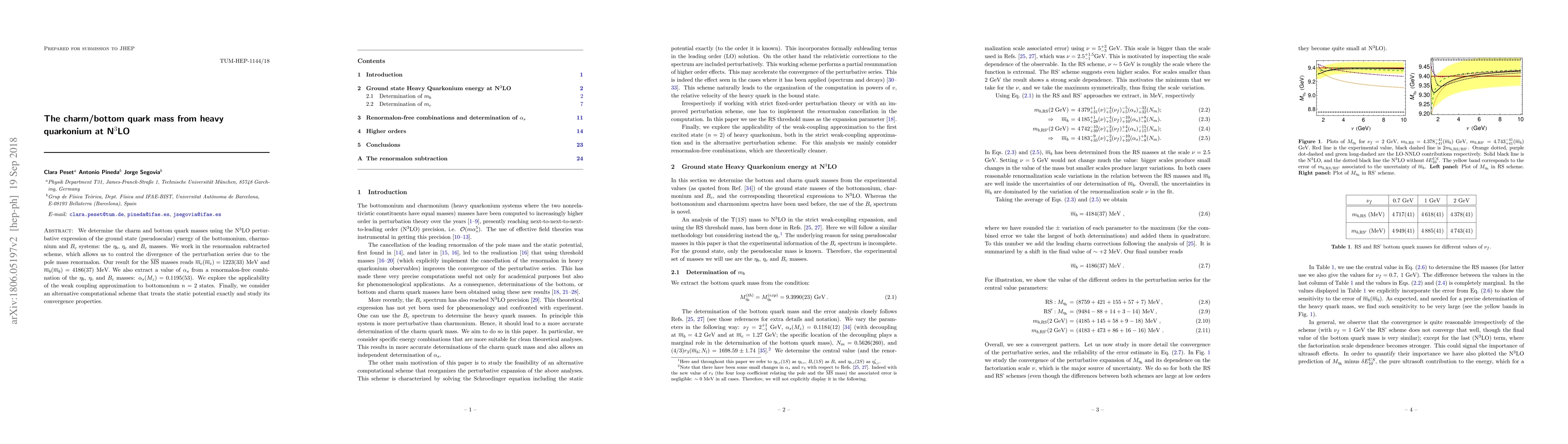 We determine the charm and bottom quark masses using the N$^3$LO perturbative expression of the ground state (pseudoscalar) energy of the bottomonium, charmonium and $B_c$ systems: the $\eta_b$, $\eta_c$ and $B_c$ masses. We work in the renormalon subtracted scheme, which allows us to control the divergence of the perturbation series due to the pole mass renormalon. Our result for the $\overline{\rm MS}$ masses reads ${\overline m}_{c}({\overline m}_{c})=1223(33)$ MeV and ${\overline m}_{b}({\overline m}_{b})=4186(37)$ MeV. We also extract a value of $\alpha_s$ from a renormalon-free combination of the $\eta_b$, $\eta_c$ and $B_c$ masses: $\alpha_s(M_z)=0.1195(53)$. We explore the applicability of the weak coupling approximation to bottomonium $n=2$ states. Finally, we consider an alternative computational scheme that treats the static potential exactly and study its convergence properties.
