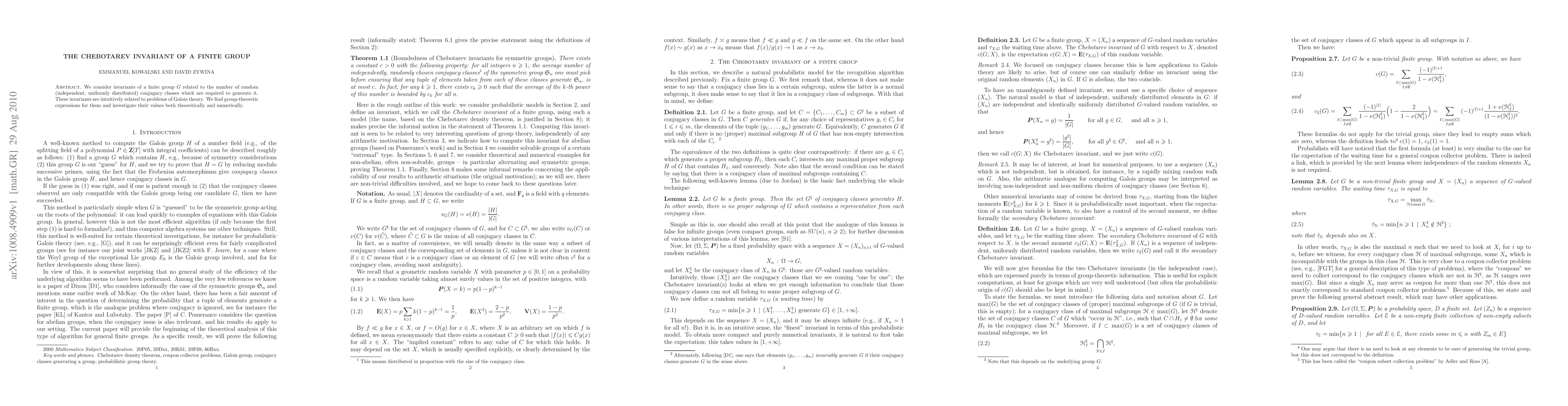 We consider invariants of a finite group related to the number of random (independent, uniformly distributed) conjugacy classes which are required to generate it. These invariants are intuitively related to problems of Galois theory. We find group-theoretic expressions for them and investigate their values both theoretically and numerically.