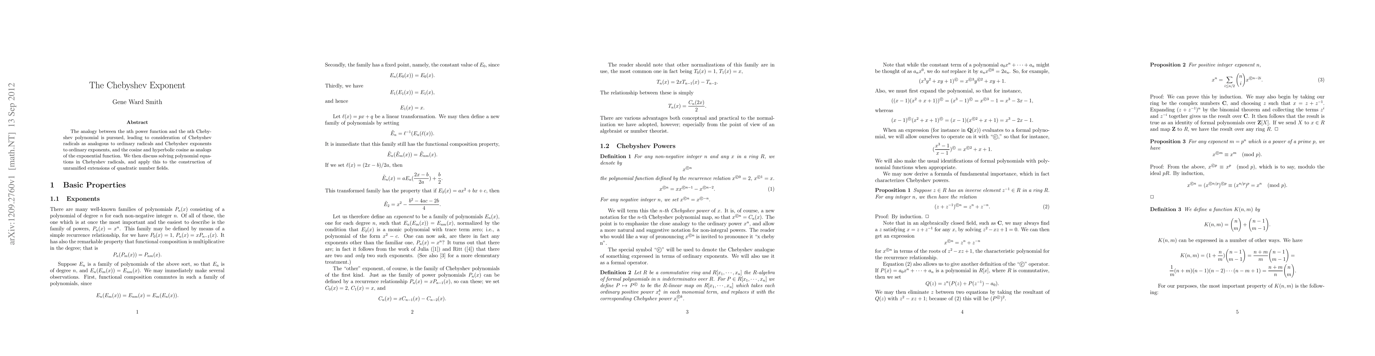 The analogy between the nth power function and the nth Chebyshev polynomial is pursued, leading to consideration of Chebyshev radicals as analogous to ordinary radicals and Chebyshev exponents to ordinary exponents, and the cosine and hyperbolic cosine as analogs of the exponential function. We then discuss solving polynomial equations in Chebyshev radicals, and apply this to the construction of unramified extensions of quadratic number fields.