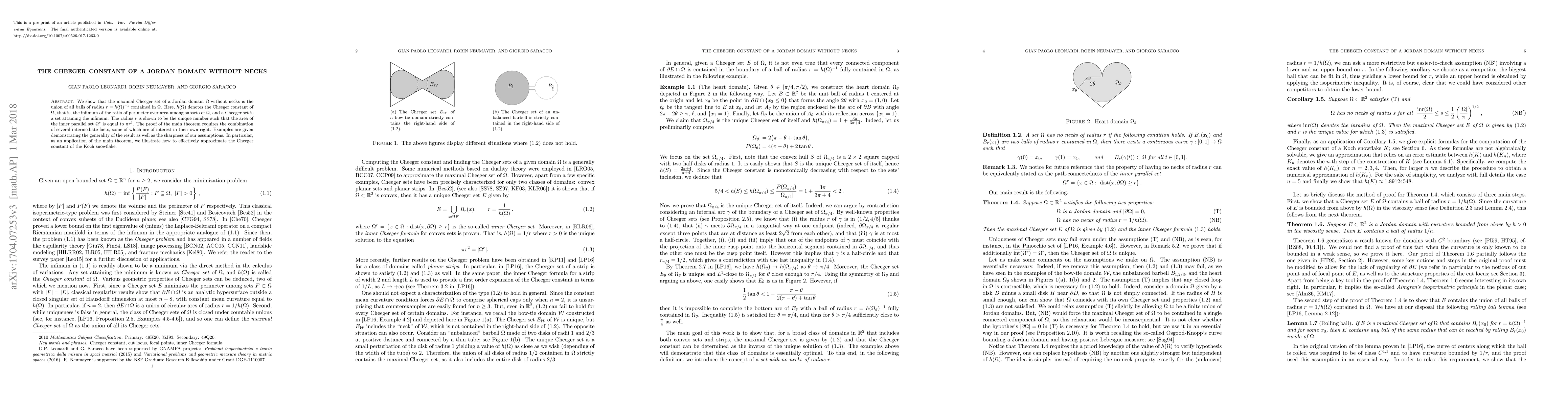 This paper demonstrates that the maximal Cheeger set of a neckless Jordan domain $\Omega$ is the union of all balls of radius $r = h(\Omega)^{-1}$, where $h(\Omega)$ is the Cheeger constant. The proof combines several intermediate results and illustrates the theorem's application in approximating the Cheeger constant of complex shapes like the Koch snowflake.
