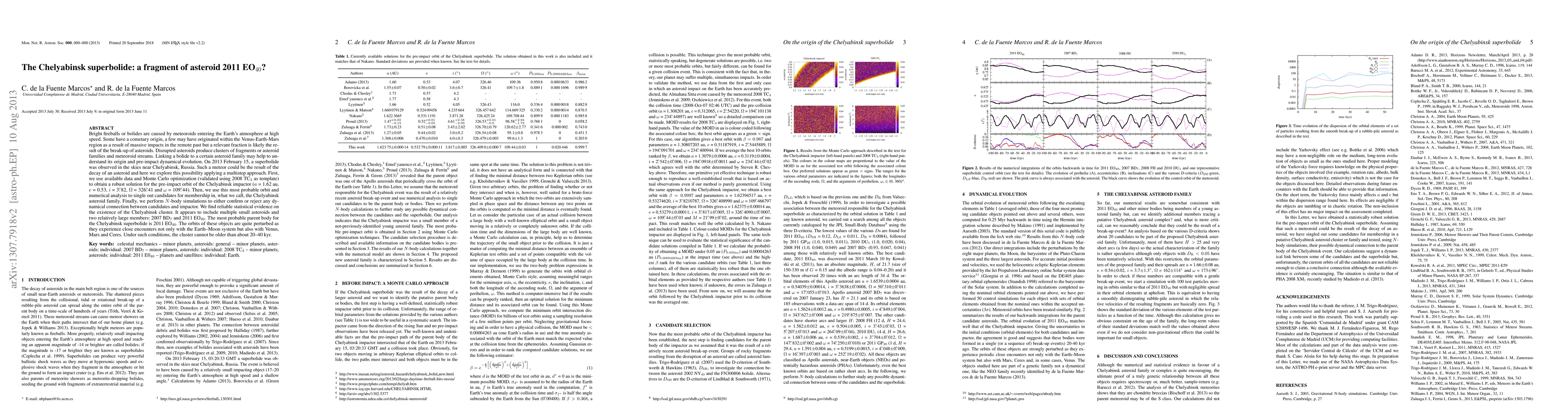 The Chelyabinsk superbolide's orbit was determined and linked to asteroid 2011 EO40 as its probable parent body, based on orbital analysis and N-body simulations. The asteroid family is young, around 20-40k years, due to close encounters with planets.