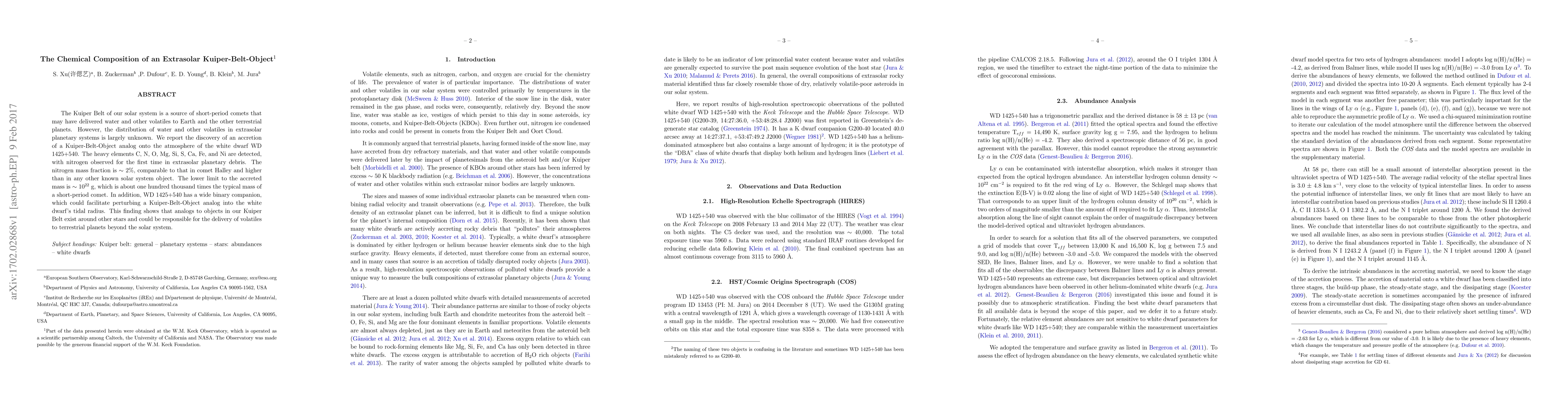 This study identifies an extrasolar Kuiper Belt Object analog accreting onto the white dwarf WD 1425+540, revealing the presence of heavy elements including nitrogen, which is observed for the first time in such debris. This discovery suggests the potential for analogous objects to deliver volatiles to planets in other systems.