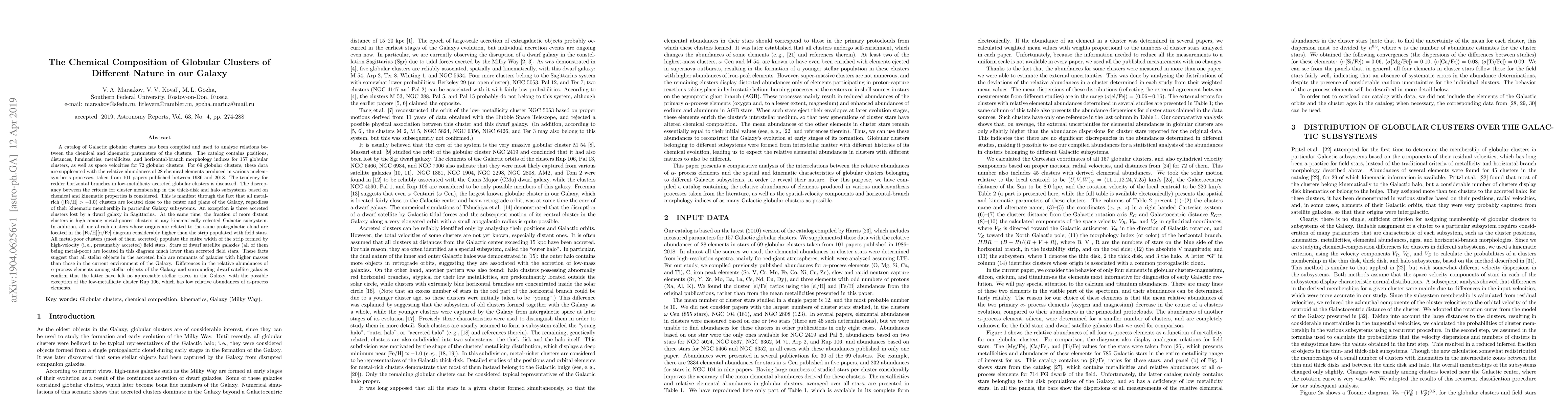 A catalog of Galactic globular clusters has been compiled and used to analyze relations between the chemical and kinematic parameters of the clusters. The catalog contains positions, distances, luminosities, metallicites, and horizontal-branch morphology indices for 157~globular clusters, as well as space velocities for 72~globular clusters. For 69~globular clusters, these data are suppleented with the relative abundances of 28~chemical elements produced in various nuclear-synthesis processes, taken from 101~papers published between 1986 and 2018. The tendency for redder horizontal branches in low-metallicity accreted globular clusters is discussed. The discrepancy between the criteria for cluster membership in the thick-disk and halo subsystems based on chemical and kinematic properties is considered. This is manifest through the fact that all metal-rich ($\rm{[Fe/H]} > -1.0$) clusters are located close to the center and plane of the Galaxy, regardless of their kinematic membership in particular Galaxy subsystems. An exception is three accreted clusters lost by a dwarf galaxy in Sagittarius. At the same time, the fraction of more distant clusters is high among metal-poorer clusters in any kinematically selected Galactic subsystem.