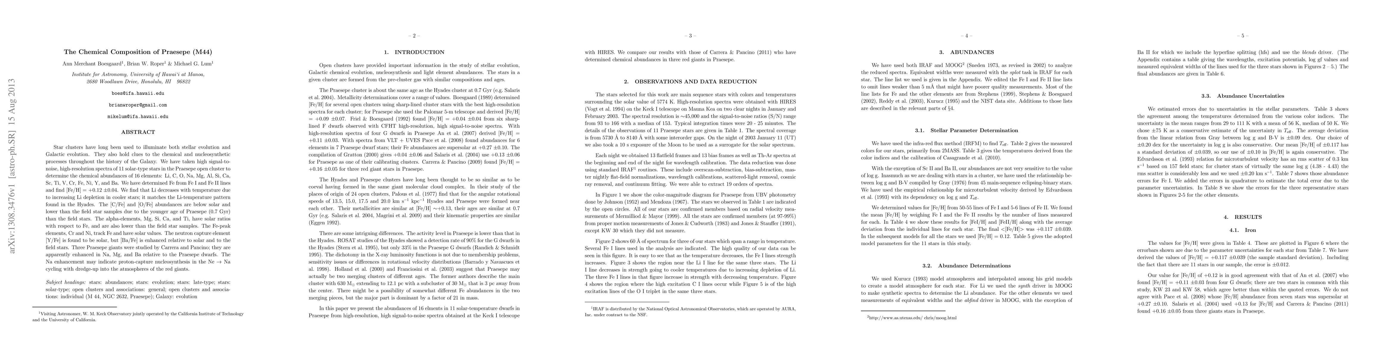 This study analyzes the chemical composition of 11 solar-type stars in the Praesepe open cluster, finding [Fe/H] = +0.12 ± 0.04. It reveals that Li depletion mirrors the Hyades pattern, while [C/Fe] and [O/Fe] are subsolar due to Praesepe's younger age. Alpha-elements match Fe ratios, Fe-peak elements are solar, and [Y/Fe] is solar but [Ba/Fe] is enhanced. Praesepe giants show Na, Mg, and Ba enhancement, suggesting proton-capture nucleosynthesis.