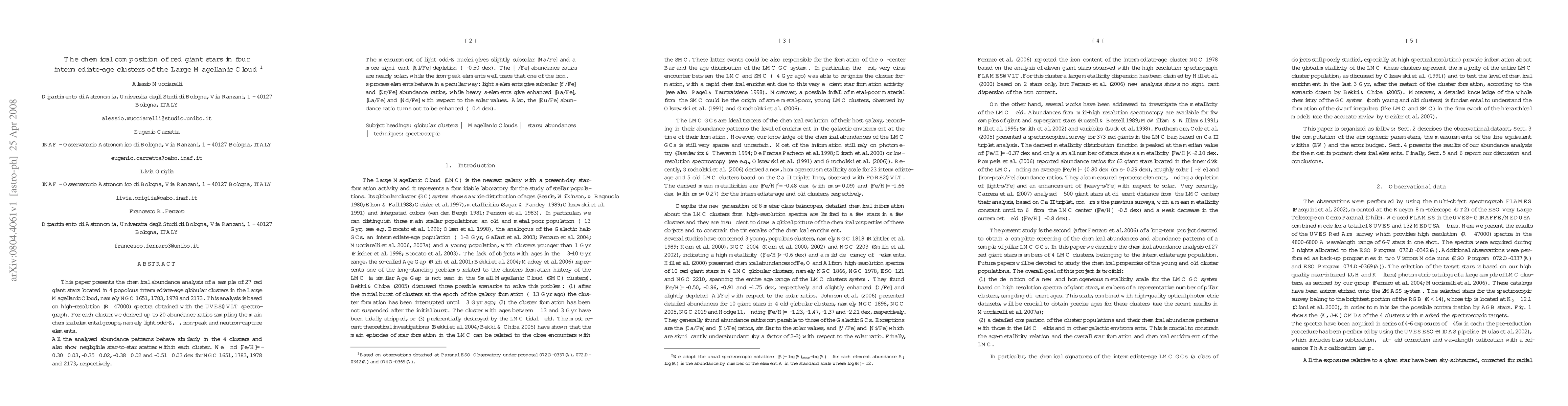 This study analyzes the chemical composition of 27 red giant stars in four intermediate-age globular clusters in the Large Magellanic Cloud, revealing consistent elemental abundance patterns across clusters with negligible star-to-star variation. The clusters show subsolar [Na/Fe] and a significant [Al/Fe] depletion, nearly solar [alpha/Fe] ratios, and enhanced s-process elements like [Ba/Fe] and [Eu/Fe].