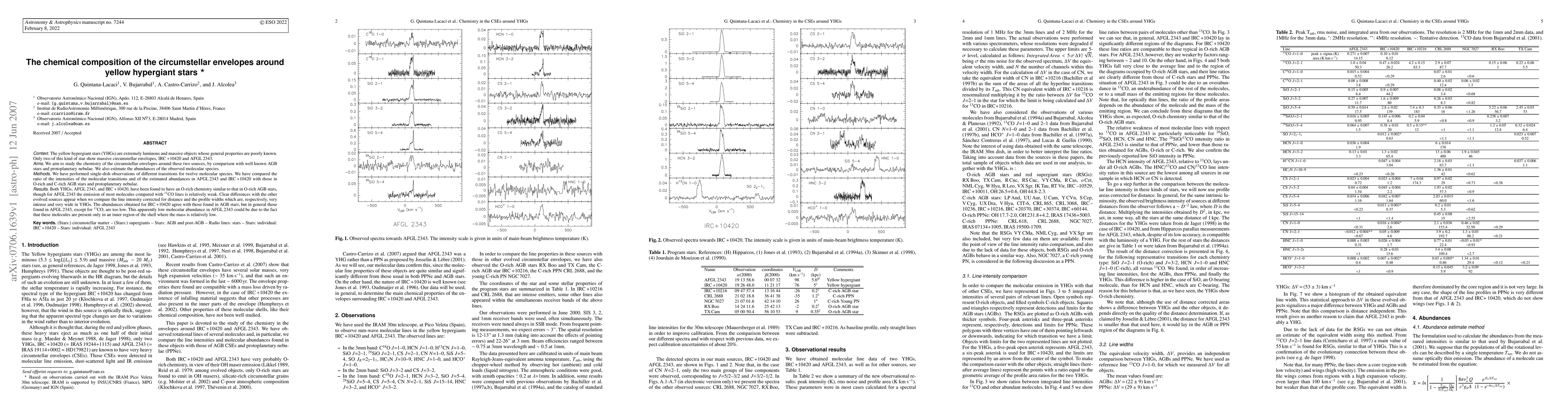 Two yellow hypergiant stars have circumstellar envelopes with O-rich chemistry similar to AGB stars, but with distinct differences in line intensity and profile widths. Abundances of molecular species vary between the two stars.