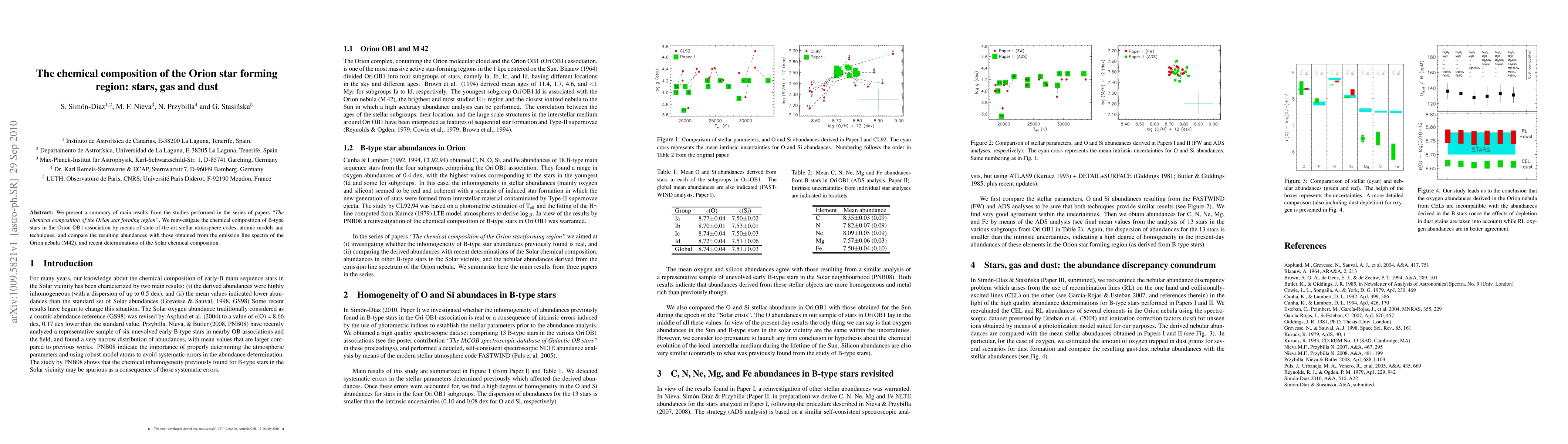 We present a summary of main results from the studies performed in the series of papers "The chemical composition of the Orion star forming region". We reinvestigate the chemical composition of B-type stars in the Orion OB1 association by means of state-of-the-art stellar atmosphere codes, atomic models and techniques, and compare the resulting abundances with those obtained from the emission line spectra of the Orion nebula (M42), and recent determinations of the Solar chemical composition.